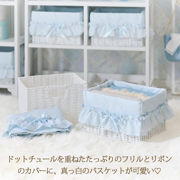 4杯のバスケットのカバーにはドットチュールを重ねたギャザーフリルと中央にリボンをあしらい、フェミンなムードを盛り上げるデザインに。