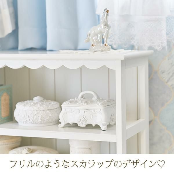 真っ白なフレームの天板下スカラップデザインが優しいムードのチェストラック。