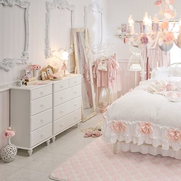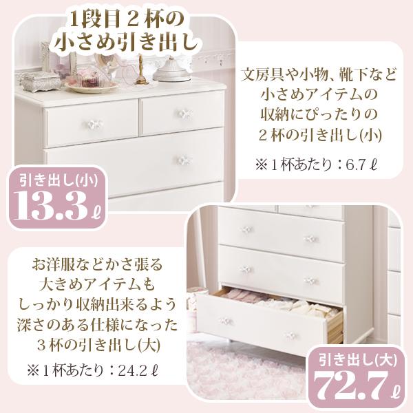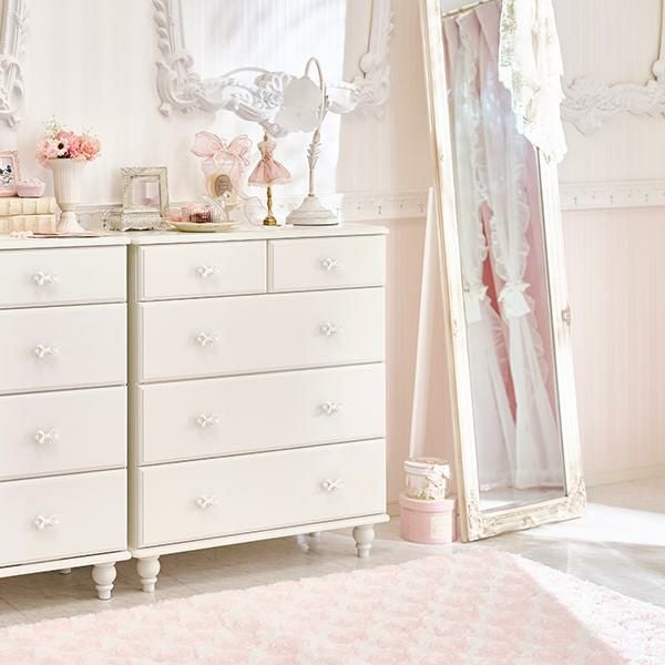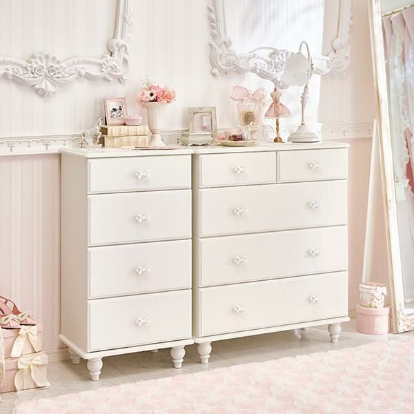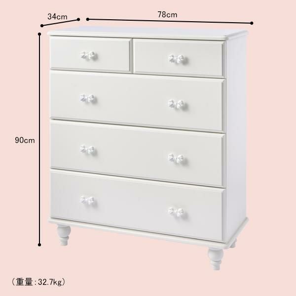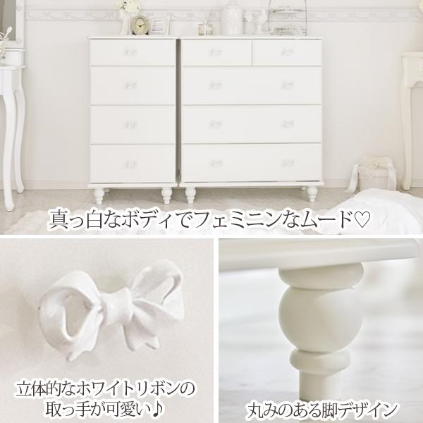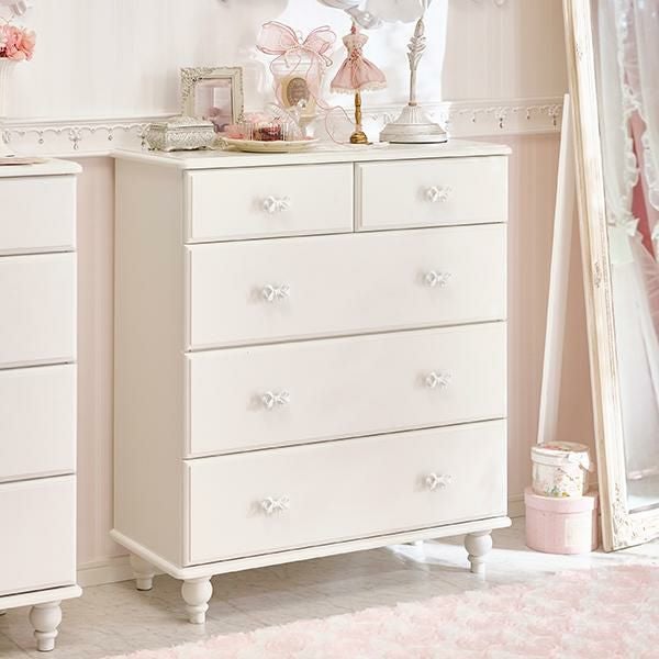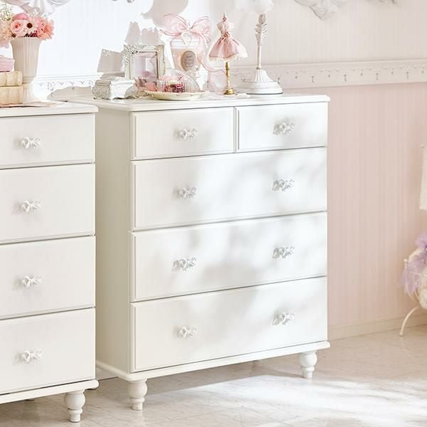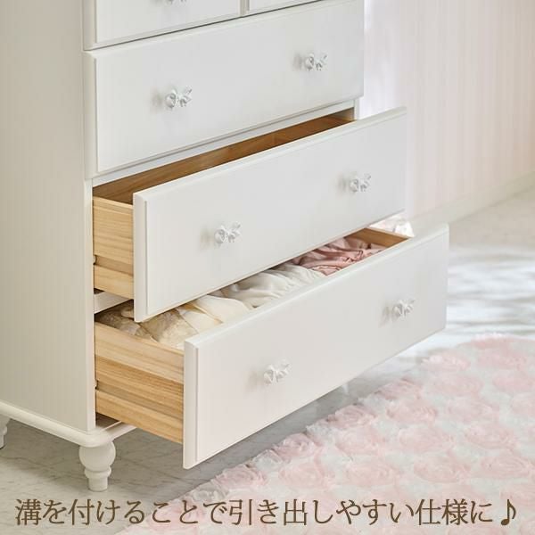優雅でクラシカルな4段5杯の大きめチェスト♪1杯にたっぷりの深さがある、収納しやすい仕様にリニューアル。ホワイトリボンの取っ手をアクセントに、脚は緩やかなカーブを描く、丸く優しいシルエットデザインにしました。裏面までオールホワイトカラーなので、空間を分ける間仕切りとしても使っていただけます。ホワイト家具ならカーテンやラグなどファブリックの色味やテイストを選ばず可愛いお部屋作りが叶います!引き出しサイドには溝を付けて引き出しやすい仕様に。可愛いだけでなく使いやすさにもこだわりました。脚部のみの取付なので届いてすぐに使えるのも嬉しいポイント♪