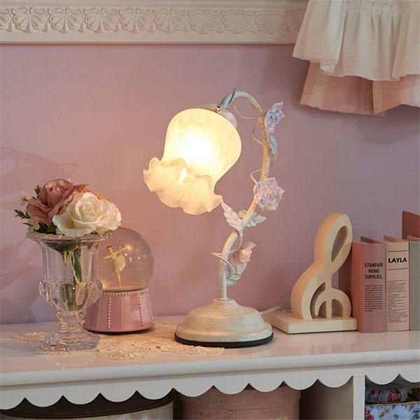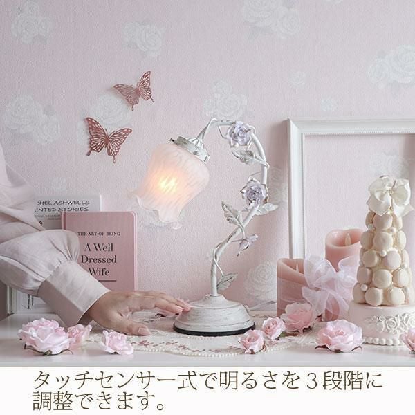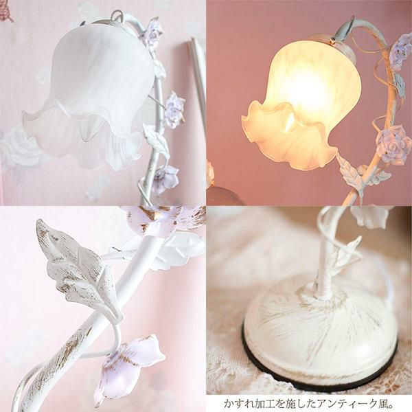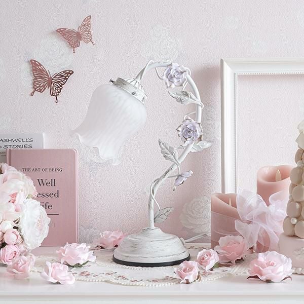 1灯のスタンドライトは、すずらんのような丸みを帯びたシェードと、ローズをまとったスタンドが、大人ロマンティックなライト。まだら模様のガラスシェードからこぼれる灯りや、かすれ加工を施したスタンド部が、お部屋をアンティークな雰囲気に演出します。タッチ式の3段調光機能付。シェードと電球を取り付けるだけですぐにお使いいただけます。