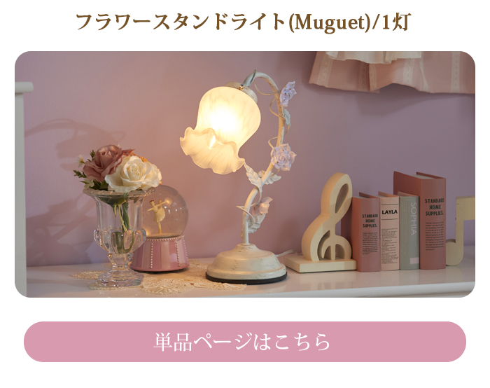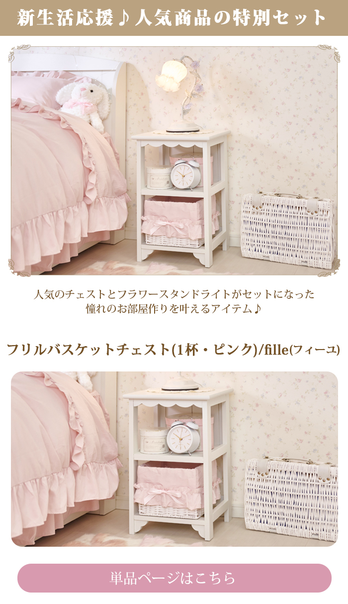 スカラップデザインが可愛いサイドチェストに、上品なフラワースタンドライトがセットになりました♪