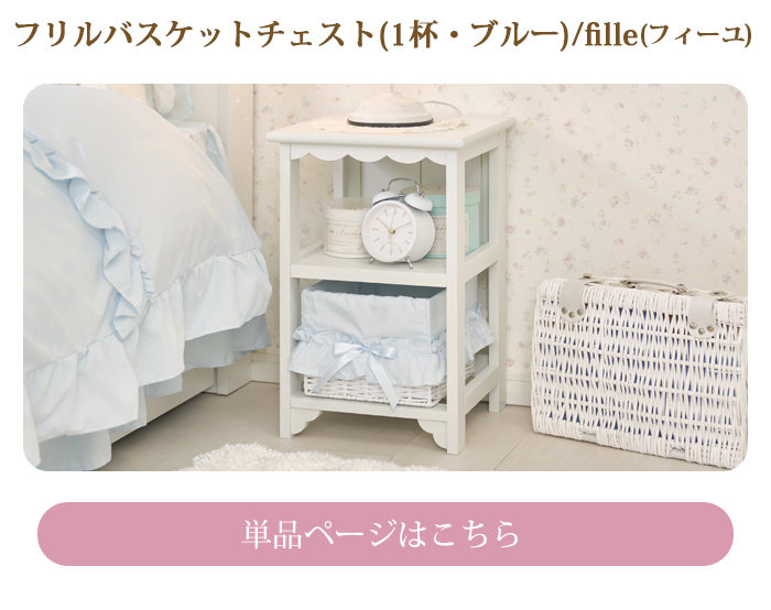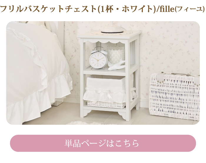バスケットラックのカバーは、ドットチュールを重ねたフリルの中央にリボンをあしらい、フェミンなムードを盛り上げるデザインに。