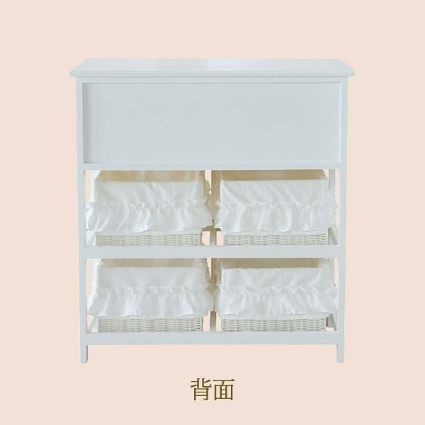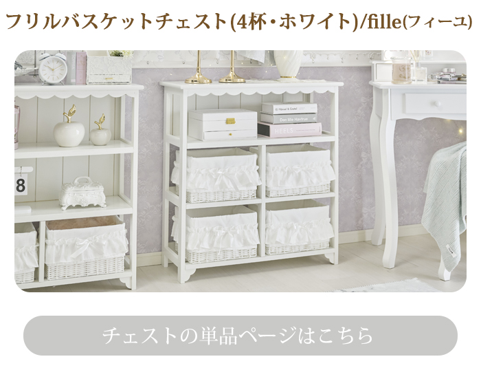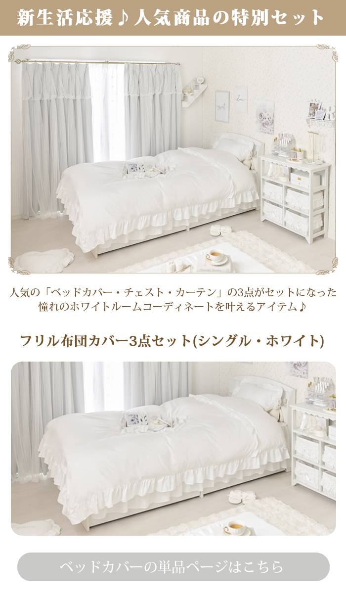 ボックスチェストは、スカラップデザインのホワイトフレームに、ドットチュール×リボン付きバスケットを組み合わせた優しい印象。軽くて扱いやすく、完成品なので届いてすぐ使えます。カバーリングは、主張しすぎないミニフリルが可愛いピュアホワイトの3点セット。しっとりなめらかな微起毛素材で、オールシーズン快適。ベッドシーツはスカート付きで、ベッド下も美しく隠せます。カーテンは、2級遮光ドレープにやわらかなチュールレース生地を重ねた一体型。上飾りのチュールと2倍ヒダの仕様で、上品で華やかな窓辺を演出します。オールホワイトを基調に、可愛いお部屋づくりが叶うセットです。