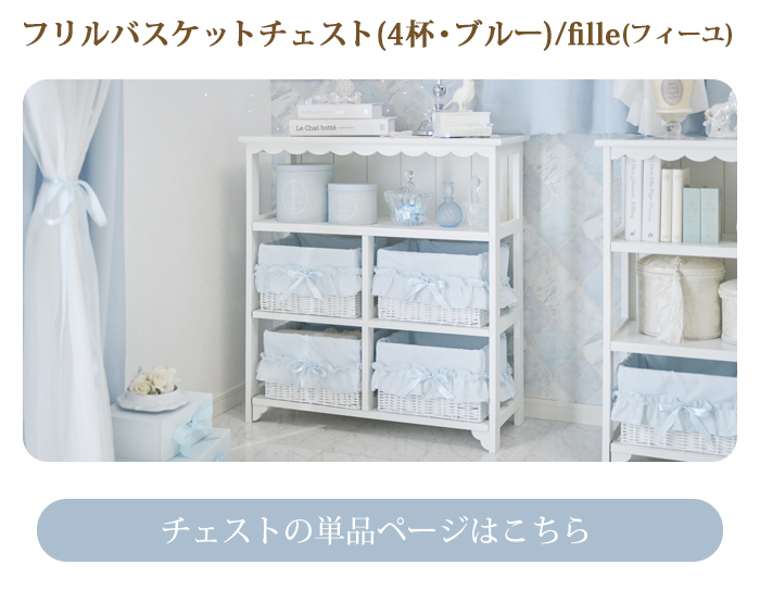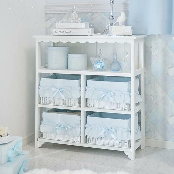 ボックスチェストは、スカラップデザインのホワイトフレームに、ドットチュール×リボン付きバスケットを組み合わせた優しい印象。軽くて扱いやすく、完成品なので届いてすぐ使えます。カバーリングは、主張しすぎないミニフリルが可愛い3点セット。しっとりなめらかな微起毛素材で、オールシーズン快適。ベッドシーツはスカート付きで、ベッド下も美しく隠せます。カーテンは3段のギャザーフリルにリボンを添えた上飾りがとってもガーリー。ドレープに重ねた柔らかなボイルレースが、優しく儚げな印象を添えます。リボンは取り外しができ、別のサテンリボンと付け替えれば、お部屋の印象をがらりと変えられます。ブルー×ホワイトで可愛いお部屋づくりが叶うセットです。