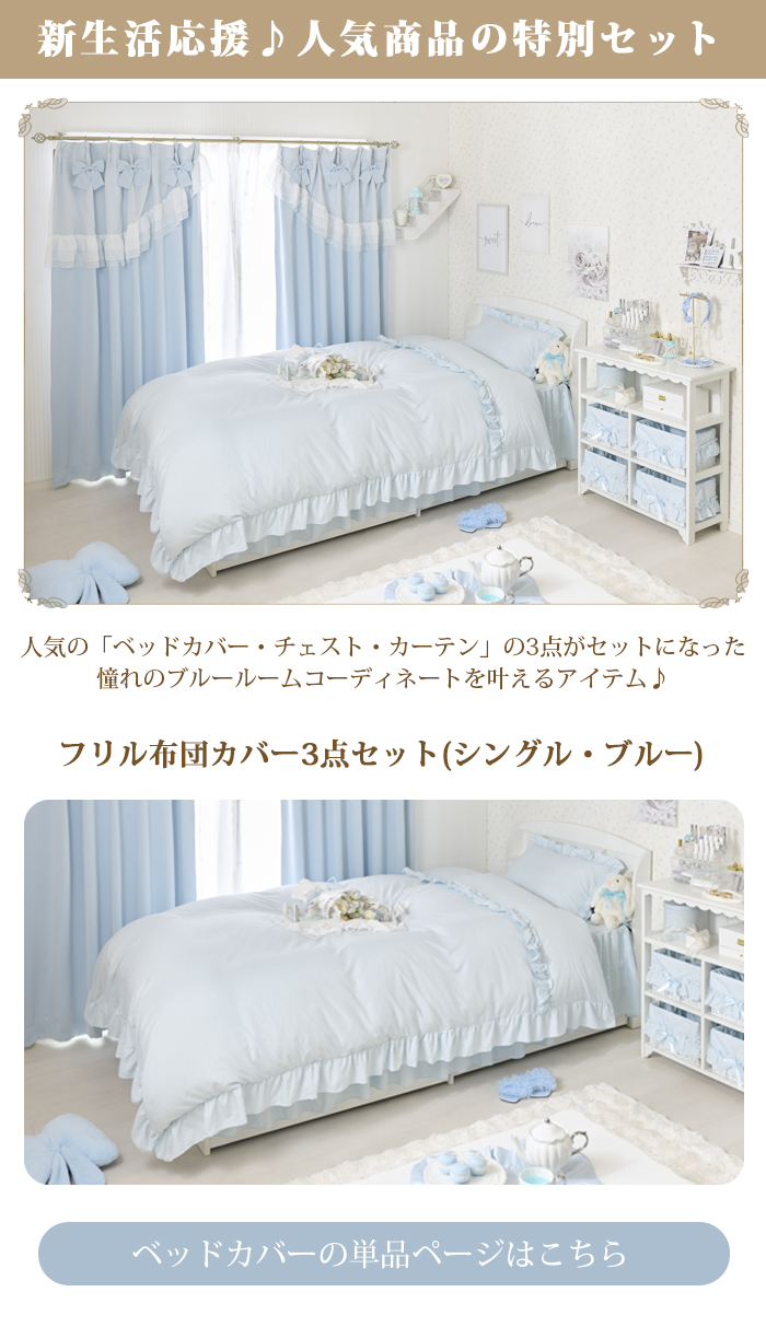 優しく淡いブルーのボックスチェストとベッドカバー、カーテンがかわいい3点セット。