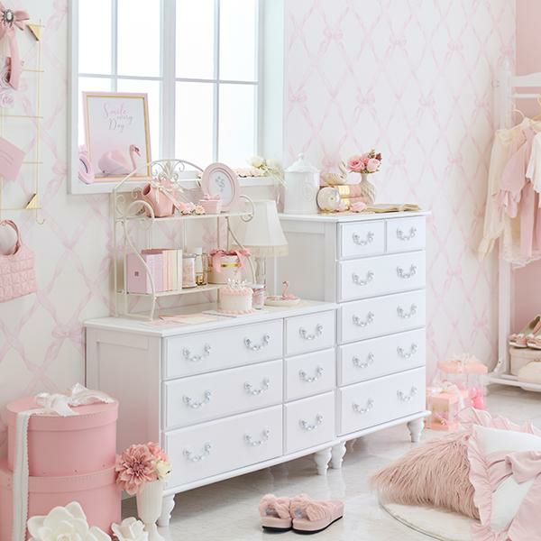 人気のホワイト系を中心に、かわいいデザインのタンスやチェスト、収納ケースを取り揃えています。爽やかで清潔感漂う白家具は、お部屋の雰囲気に調和しやすい色合いでもあるため人気です。ピュアホワイトのボディにホワイト取っ手を合わせたBlanc(ブラン)や、クリスタル調のキラキラ取っ手と優雅な曲線を描いた脚部が特徴のInnocent(イノセント)など、シリーズで揃えることでお部屋のコーディネートを統一することができるシリーズ家具も取り扱っています。