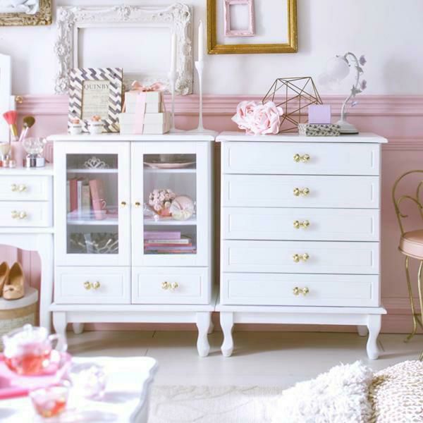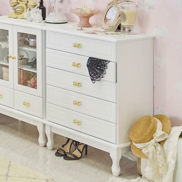無垢なホワイトを引き立てるクリスタル調の取っ手と脚部の優雅な曲線がクラシカルな雰囲気のチェスト♪