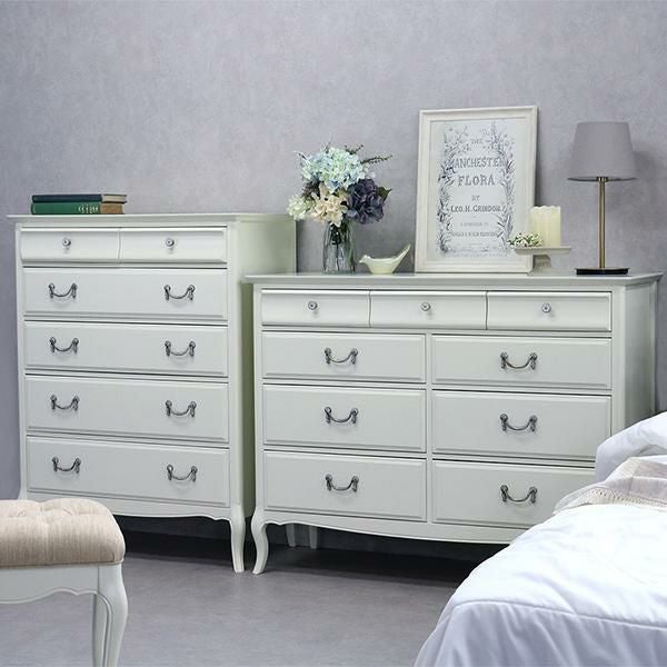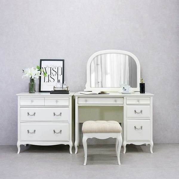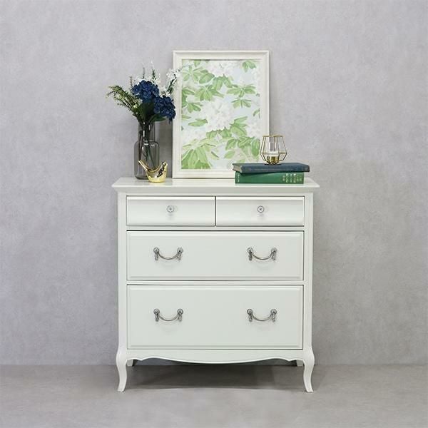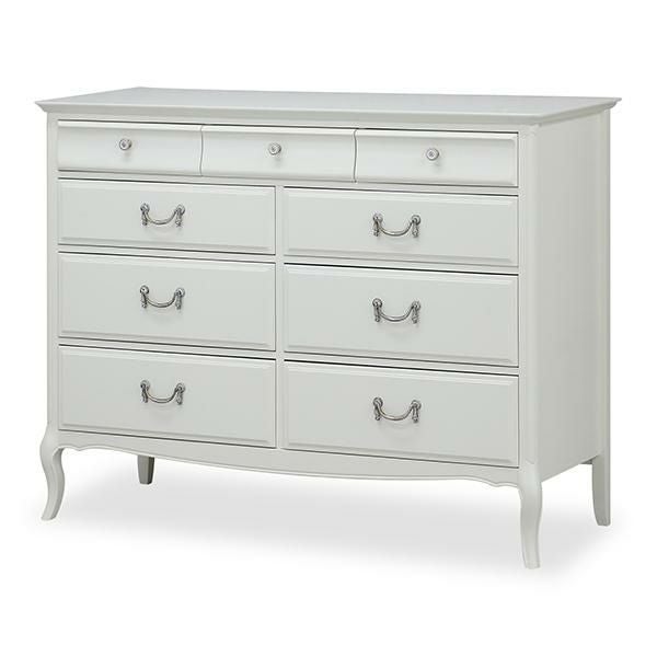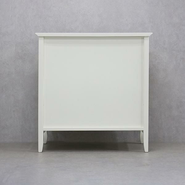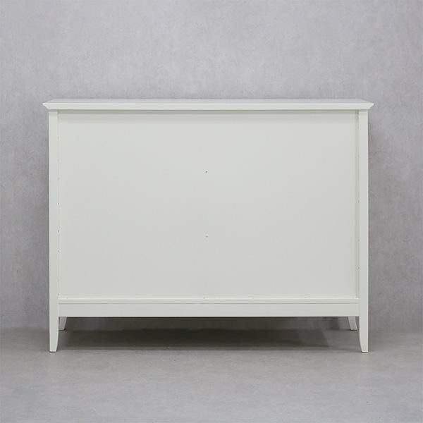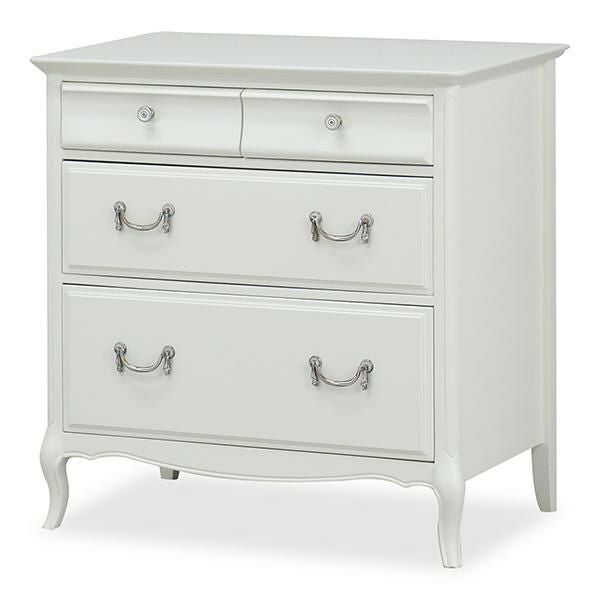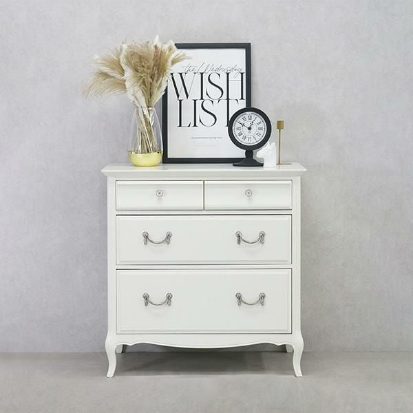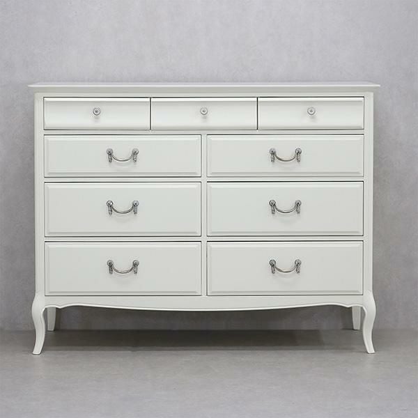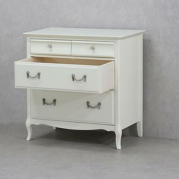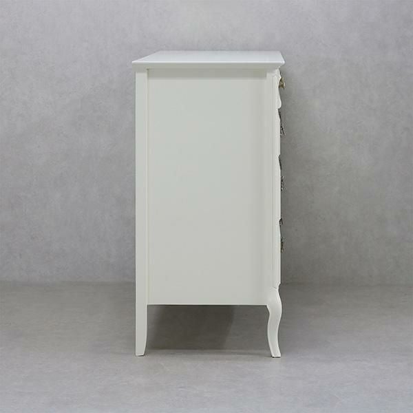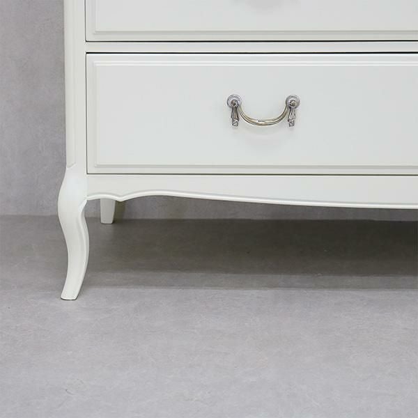 無垢なホワイトを引き立てるクリスタル調の取っ手と脚部の優雅な曲線がクラシカルな雰囲気のチェスト♪