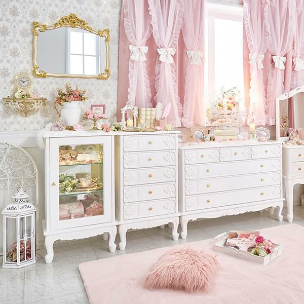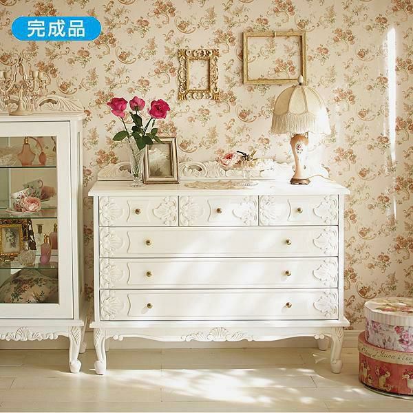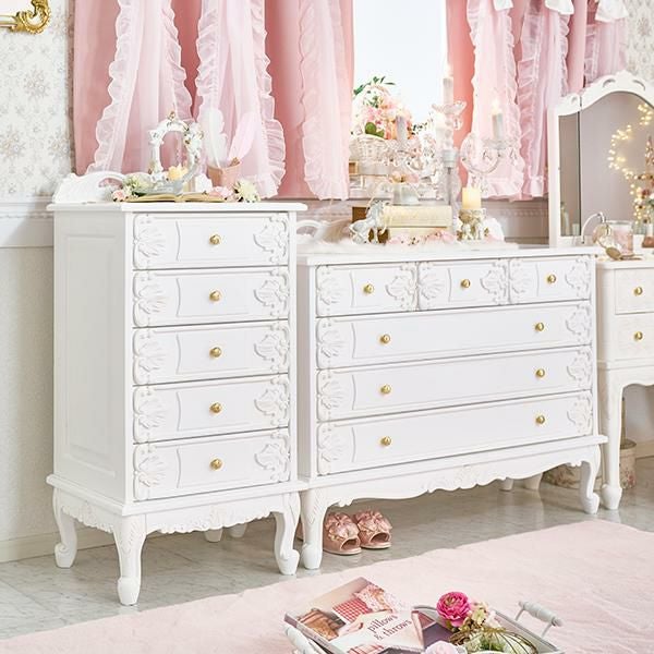 無垢なホワイトを引き立てるクリスタル調の取っ手と脚部の優雅な曲線がクラシカルな雰囲気のチェスト♪