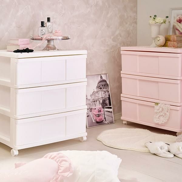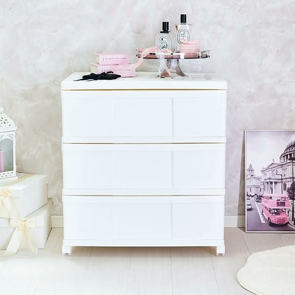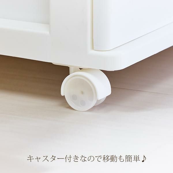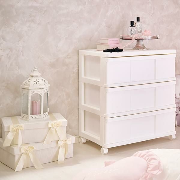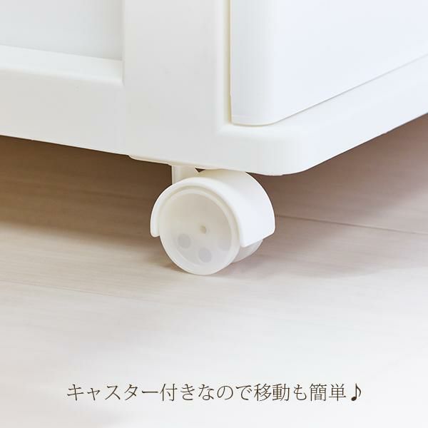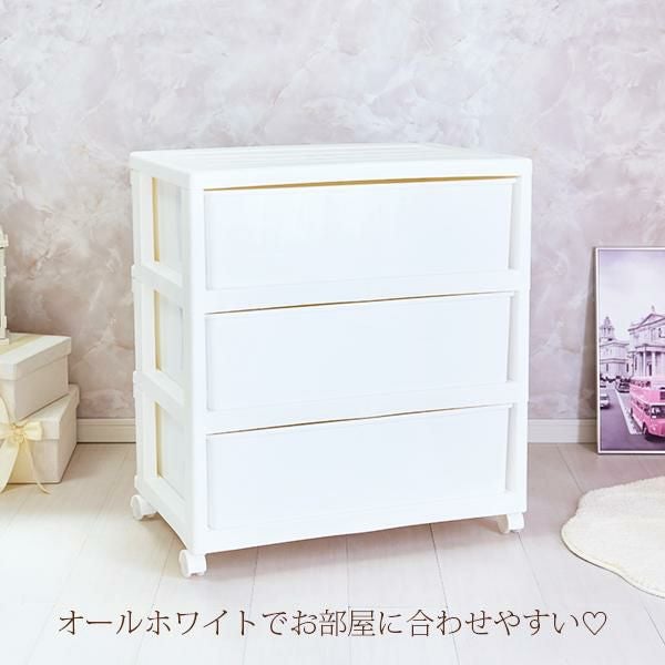 どんなインテリアにも馴染む、真っ白の3段チェスト♪幅60cmタイプでワイドな収納力。クローゼット、玄関など様々な場所で活躍するキャスター付きの3段収納ケース。シンプルなホワイトカラーは置く場所を選ばず、キャスターもオールホワイトで本体カラーと一緒が嬉しい!天板はフラットなので、仮置きスペースとして使用できます。また360度回転キャスター付きで移動も簡単。合わせやすい白色は、他カラーとの組み合わせもオススメです。