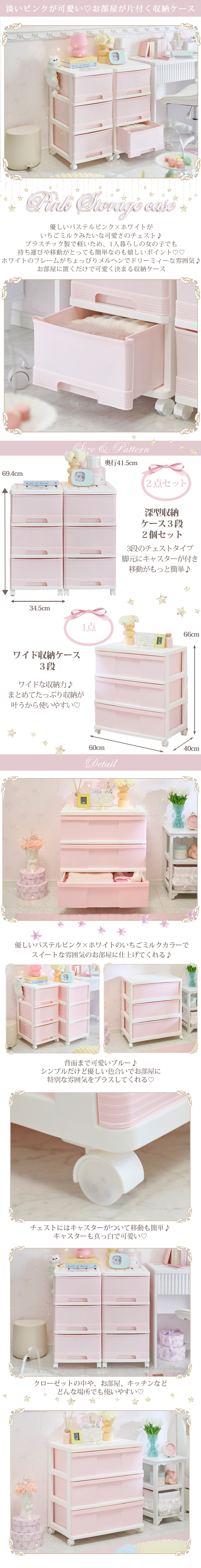 優しいパステルピンクにホワイトフレームがかわいい3段チェストの2個セット!