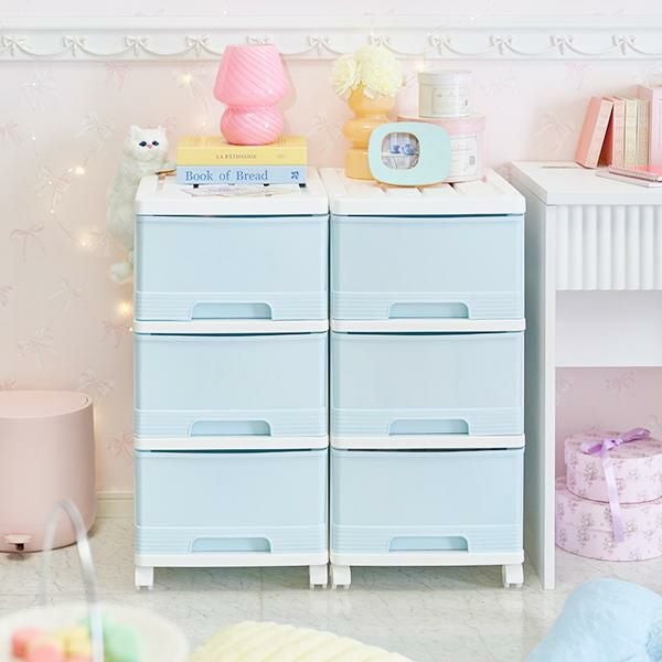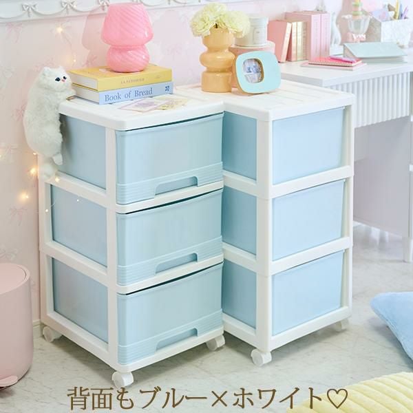 アイスブルーにホワイトフレームの淡いカラーが可愛い3段チェストの2個セット!