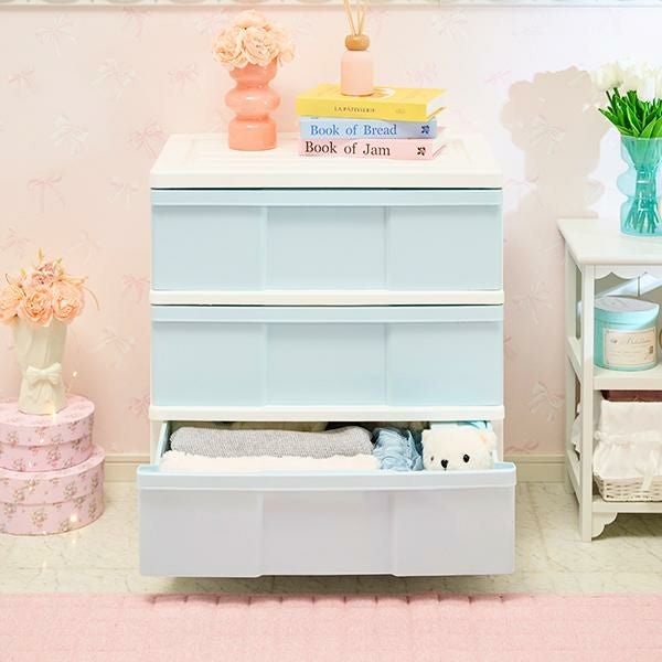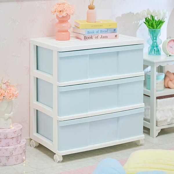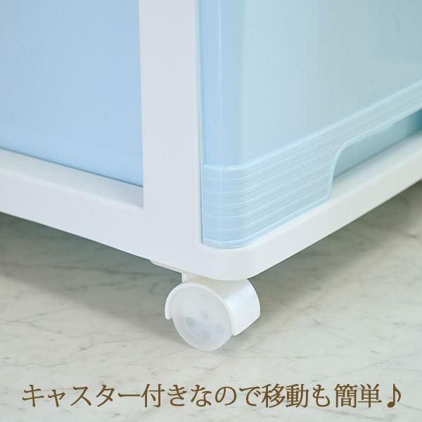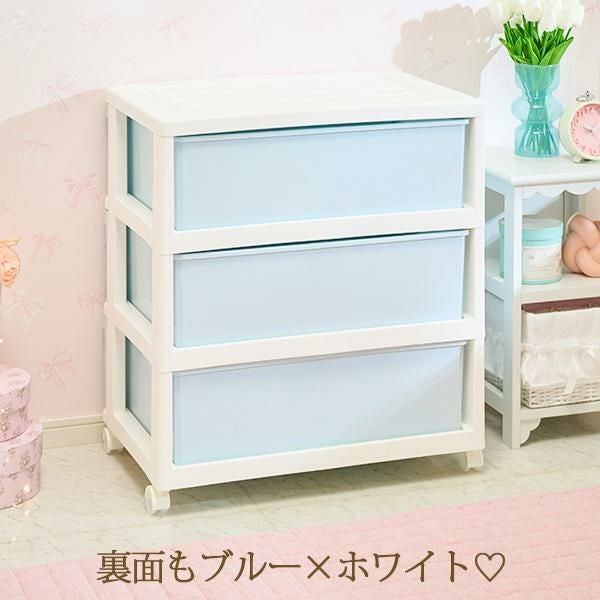 アイスブルーにホワイトフレームの淡いカラーが可愛い3段チェスト!幅60cmタイプでワイドな収納力。クローゼット、玄関など様々な場所で活躍するキャスター付きの3段収納ケース。かわいいインテリアに馴染み、アクセントにもなる、アイスブルー×ホワイトをご用意しました。キャスターもホワイトなので本体カラーに優しく馴染みます。天板はフラットで、仮置きスペースとして使用できます。また360度回転キャスター付きで移動も簡単。