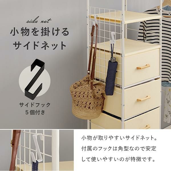 たっぷり入る5つの引き出しとS字フックを吊るして使えるサイドネット。