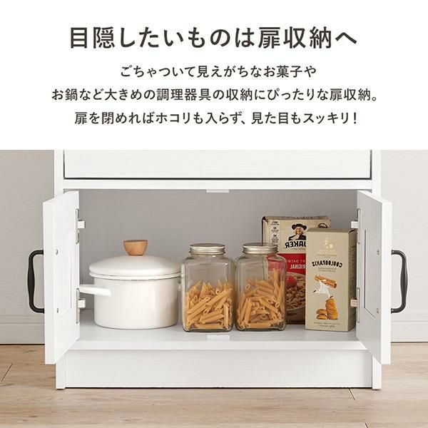 隠したいものは扉の中へ収納すればスッキリ。ごちゃついて見えがちなお菓子や、大きさがバラバラの食器棚や調理器具など、小物をエリアごとすっきり収納できます。