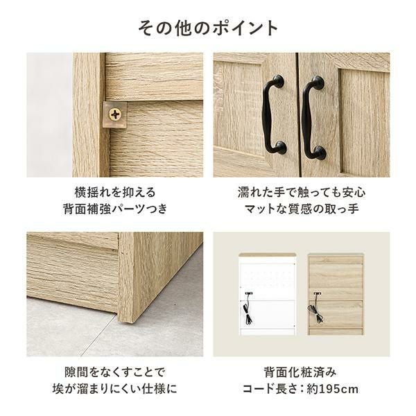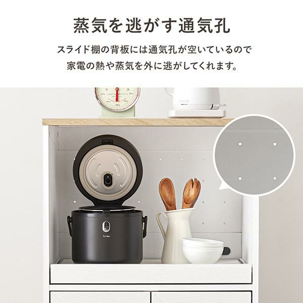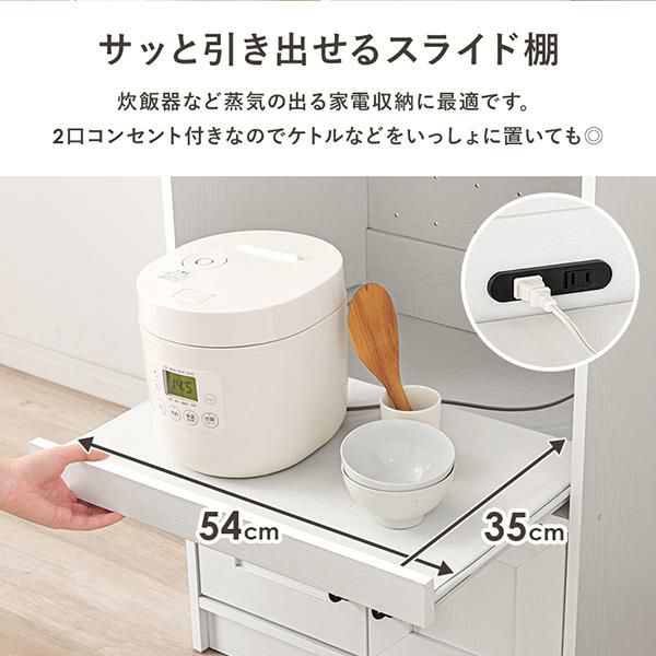 サッと引き出せるスライド棚は、2口コンセント付きなので炊飯器とケトルを置くのに便利です。