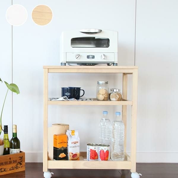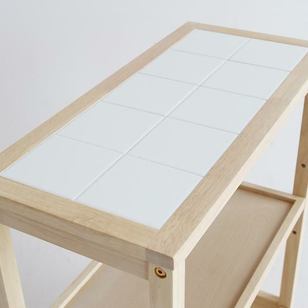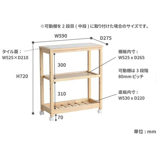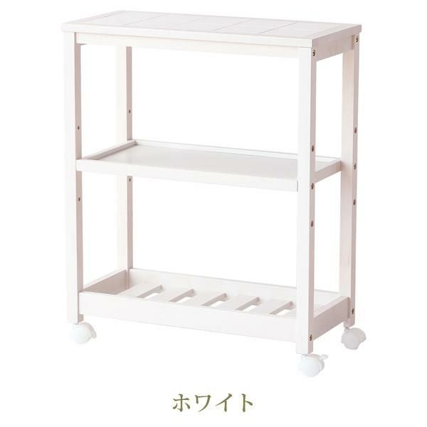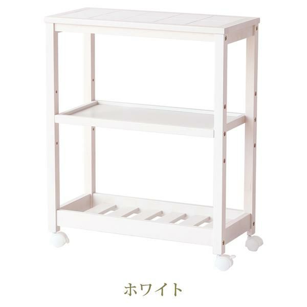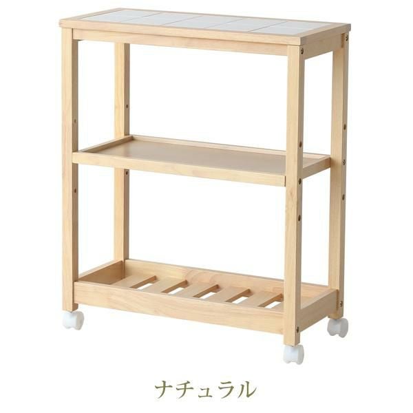 タイルトップ天板のキャスター付きワゴンです。真ん中の棚の高さは3段階から選べます。ダイニングテーブル横に併せて置きやすい高さにデザインしました。キッチン周りの雑貨や食品などをまとめてスッキリ収納できそう。