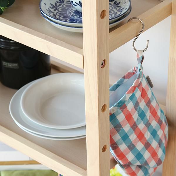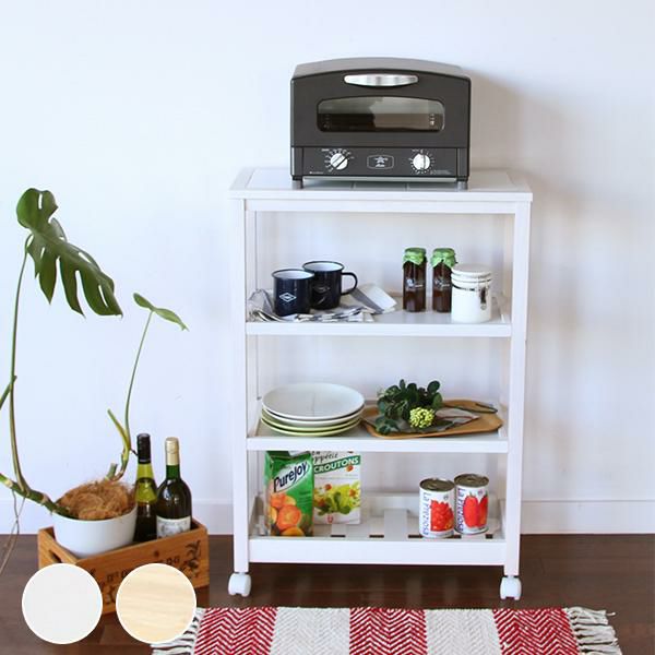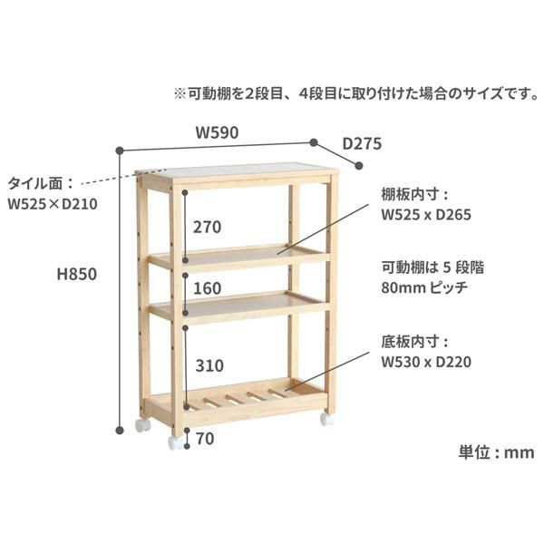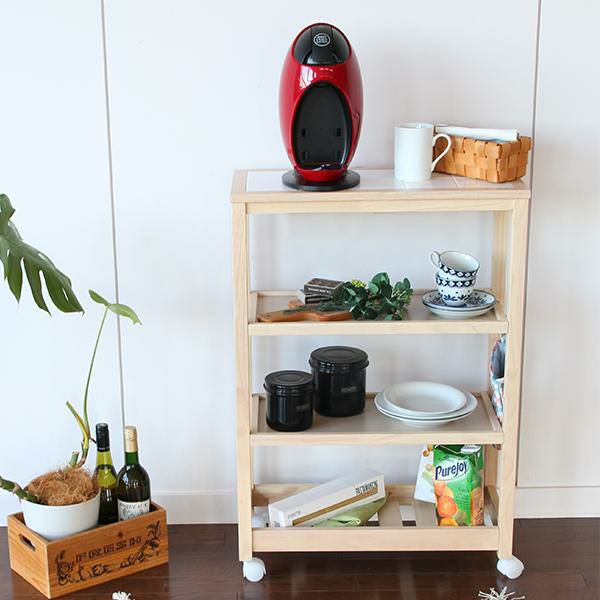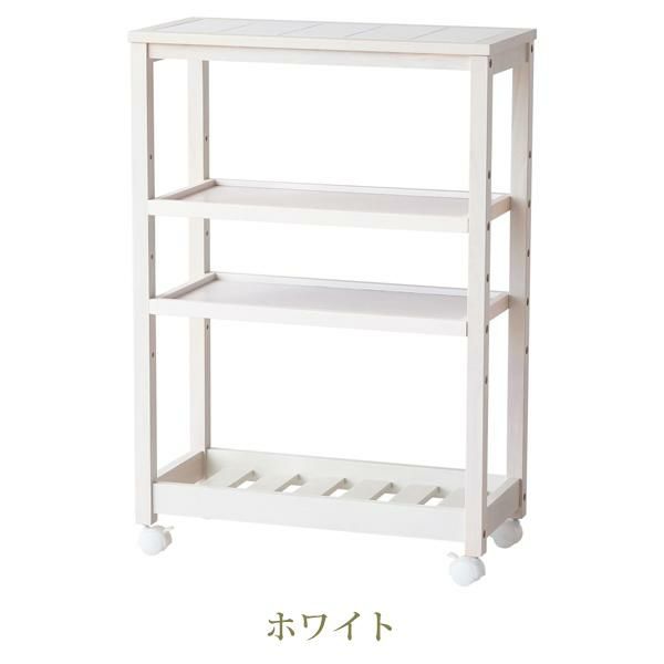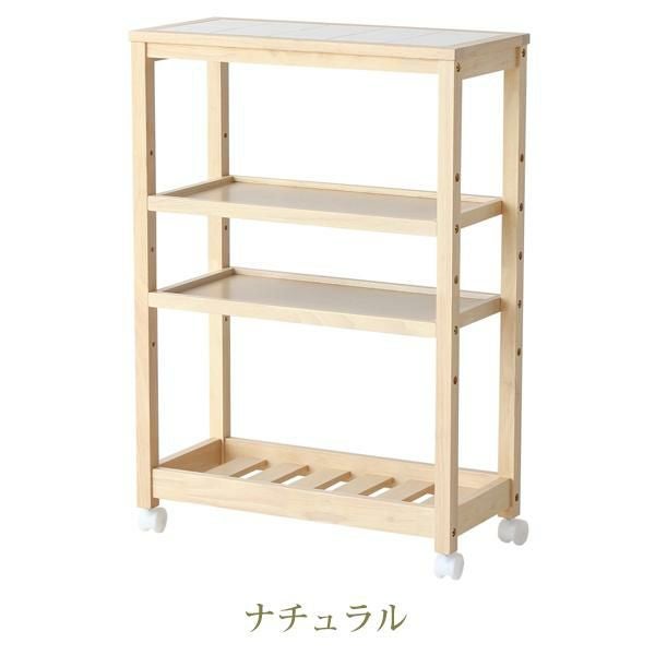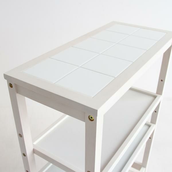 タイルトップ天板のキャスター付きワゴンです。2枚の棚板は5段階からお好きな高さで固定できます。 収納したいものに応じて位置を変えることで、スペースを無駄なく活用できます。キッチン周りの雑貨や食品などをまとめてスッキリ収納できそう。