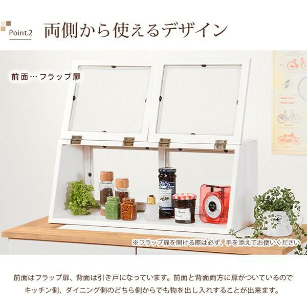前面はフラップ扉、背面は引き戸になっていて、前面と背面両方に扉が付いているのでキッチン側、ダイニング側のどちらからでも物を出し入れすることができます。