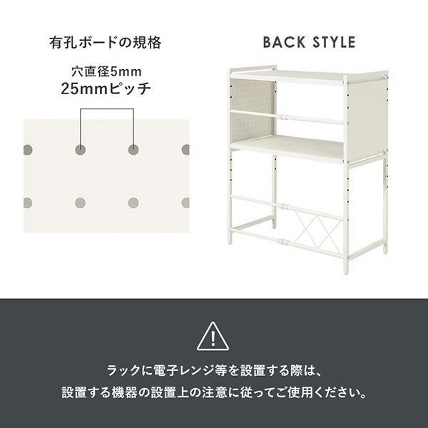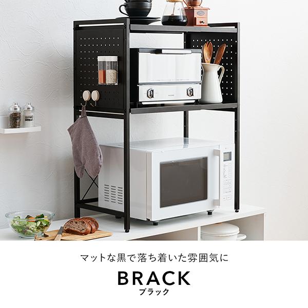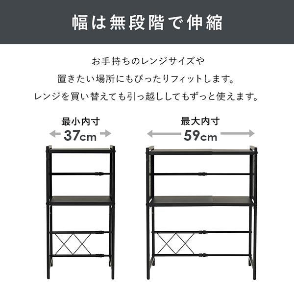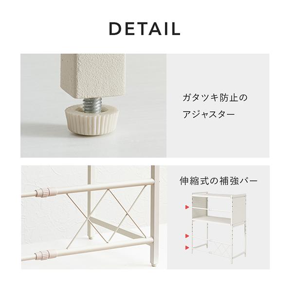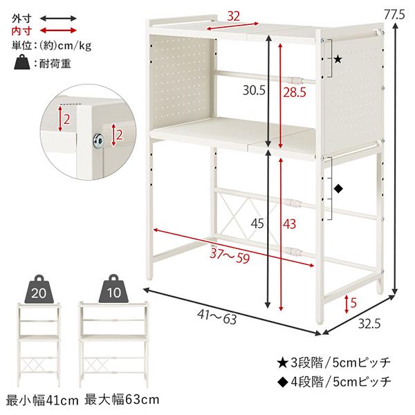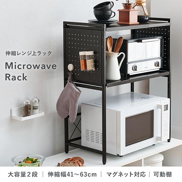 電子レンジから小型家電のケトルやティーセットなど、収納したいもののサイズに合わせて、幅や棚の高さを調節できる伸縮ラック(2段)。伸縮&高さ調節できるから、お気に入りのアイテムを丁度よくお片付け&ディスプレイできます。