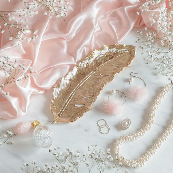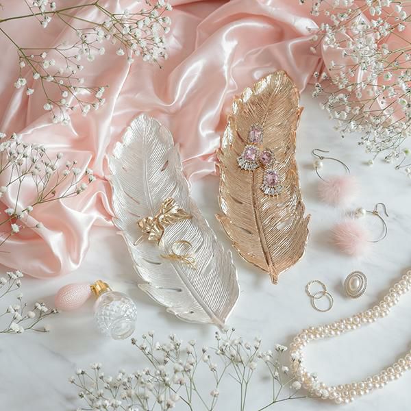 繊細なディテールで羽根をデザインしたトレー。上品なゴールドとシルバーのカラーがラグジュアリーな印象。玄関などで外出時持ち歩くアイテムのちょい置きに使用したり、お気に入りのアクセサリーや、時計などを飾るのもオススメです。