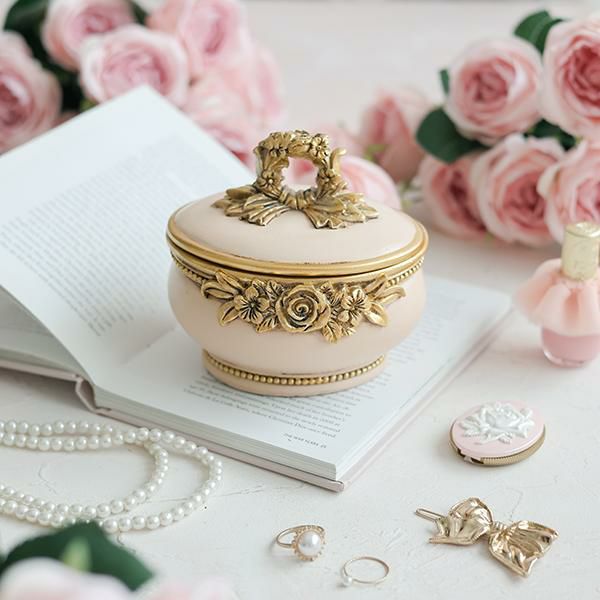 ゴージャスな薔薇のレリーフがあしらわれたオシャレな小物入れ。ドレッサー周りに置けばとっても華やかな気分に。小ぶりなのでチェスト上や、玄関などのちょっとしたスペースのアクセサリー収納としてお気に入りのジュエリーや鍵を入れても♪高級感のあるデザインでギフトにもオススメです。