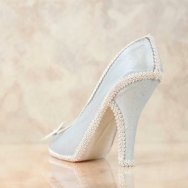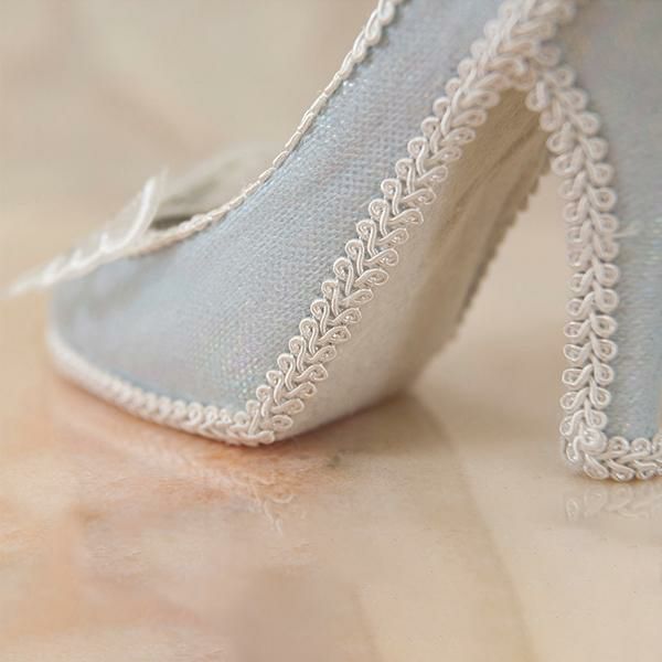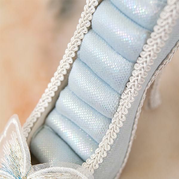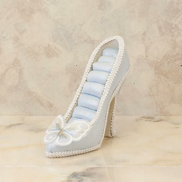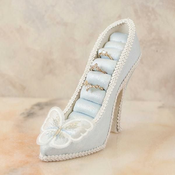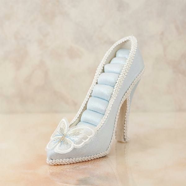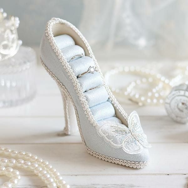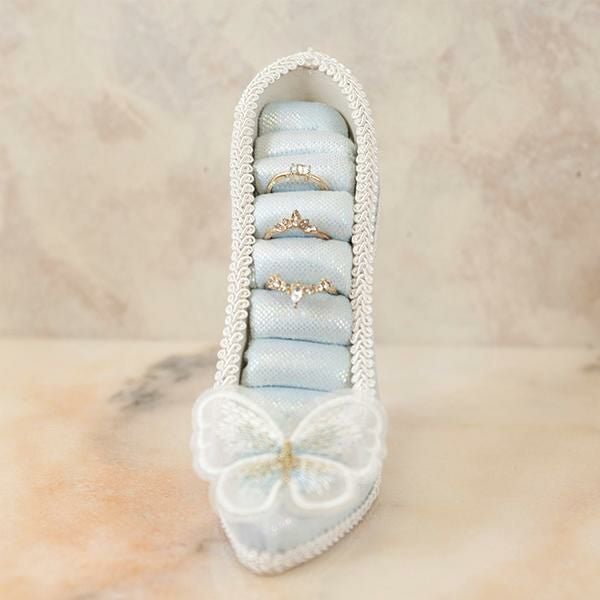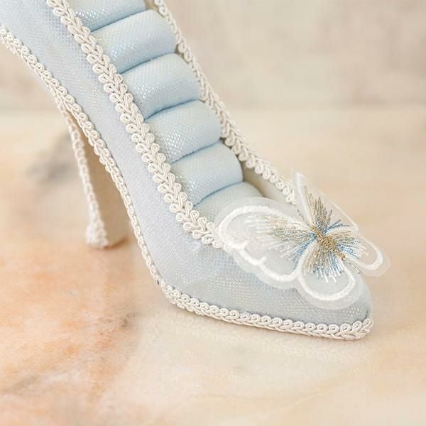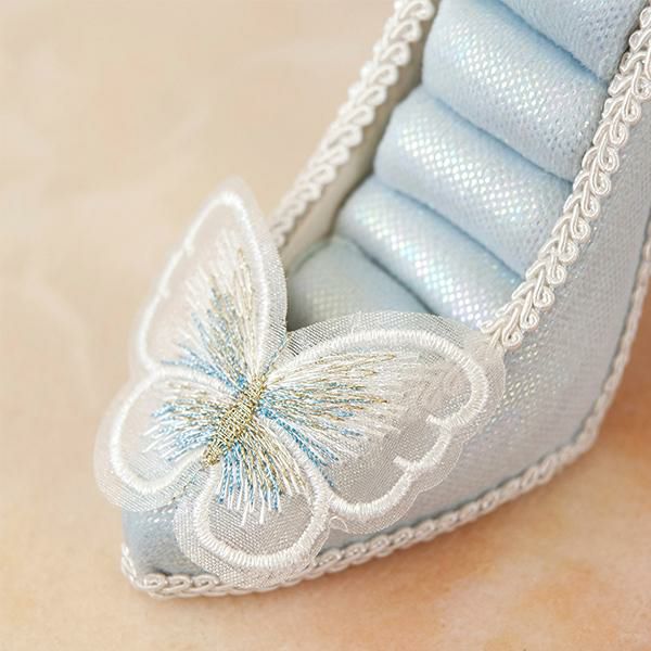 淡い水色と、つま先の蝶々モチーフのレースが美しい、クラシカルなムードたっぷりのリングホルダー。きらきらしている生地がとても華やかで、お気に入りのリングをより可愛く保管できます。