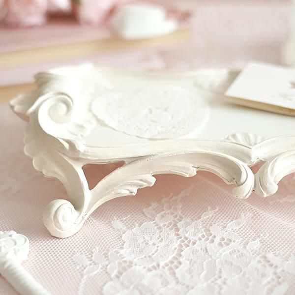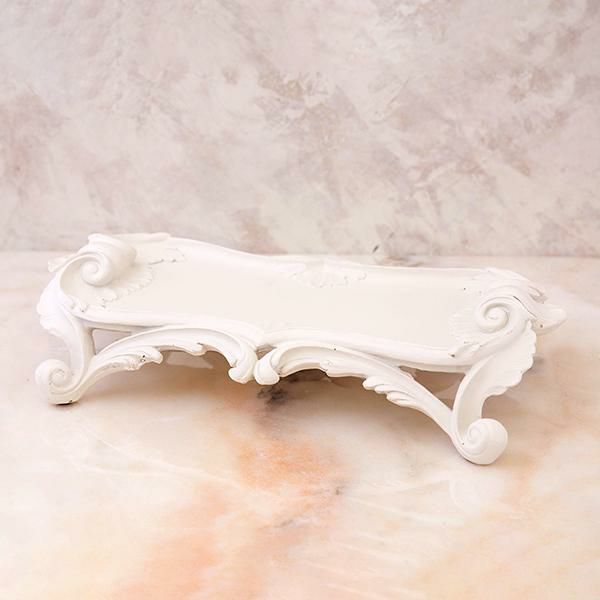 アンティーク調装飾や塗装が上品なディスプレイトレーです。クラシカルなデザインと優しいホワイトカラーが美しいアイテム。お気に入りのリングやネックレスなどのアクセサリーの定位置として、ミニボトルの香水を飾る場所として、置くだけでオシャレなムードに♪