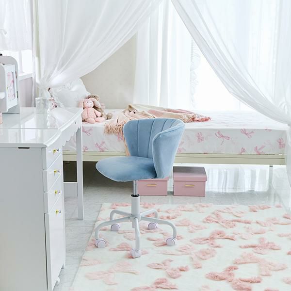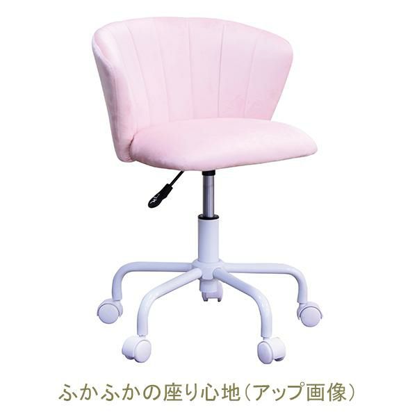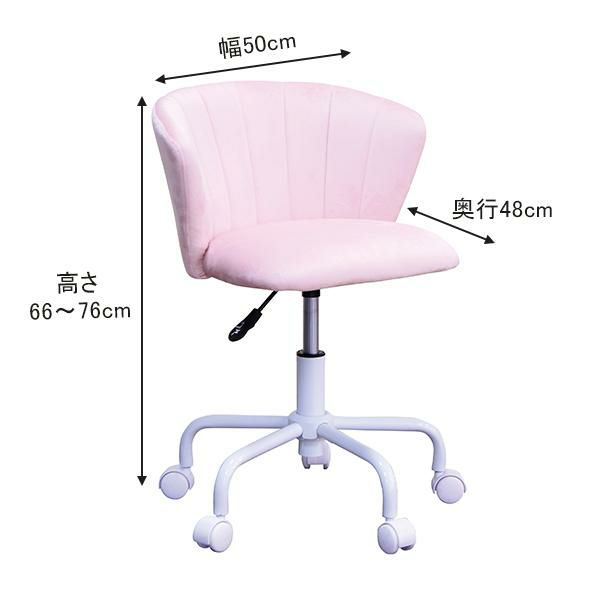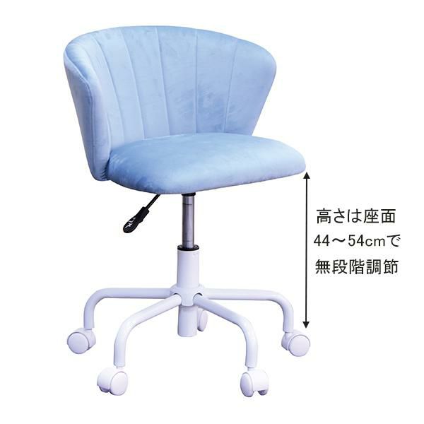 シェル型のかわいい背もたれと通気性に優れた快適なすわり心地。座面は360度回転し、5つのキャスターで安定感があります。高さもガス圧昇降式でお好みの高さ(44~54cm)に調整可能。
