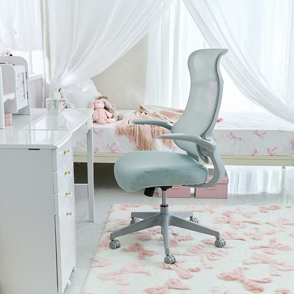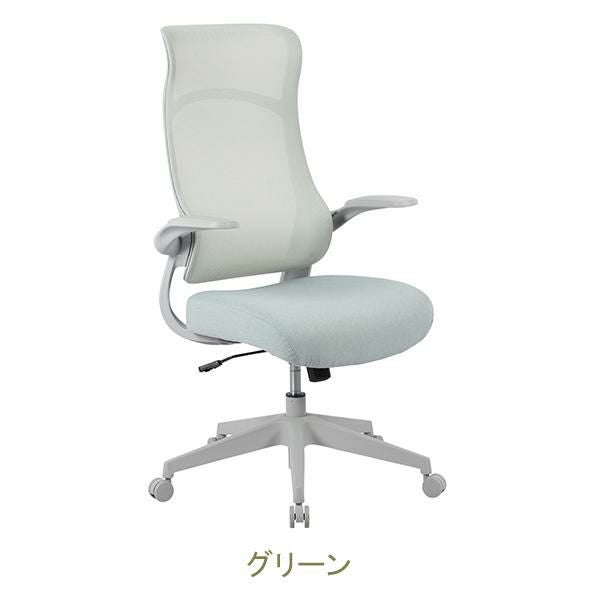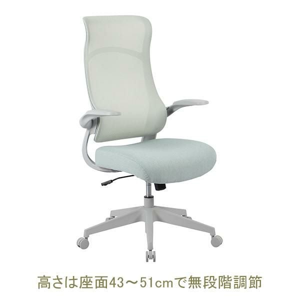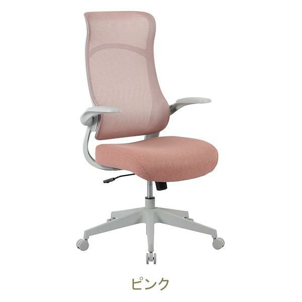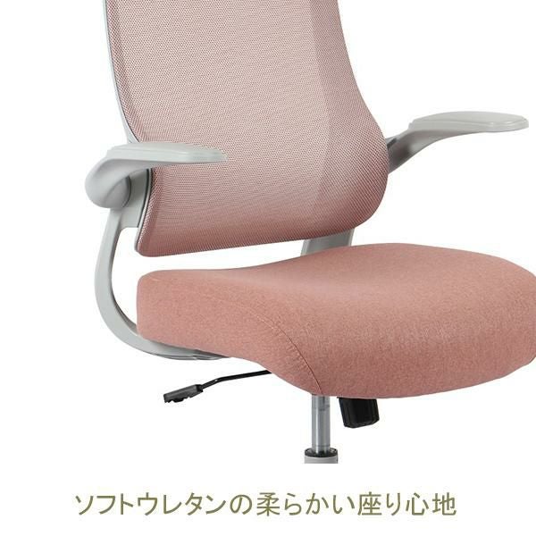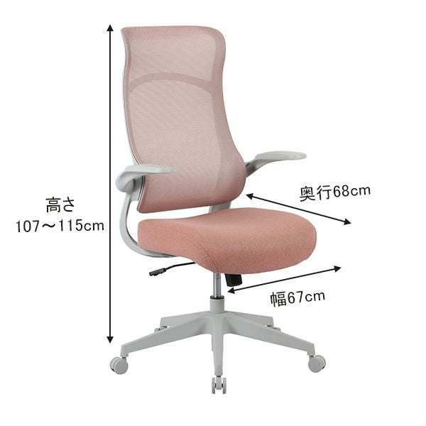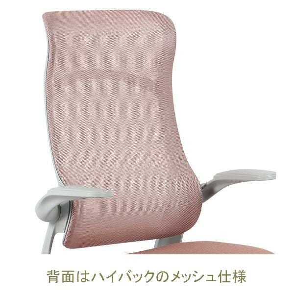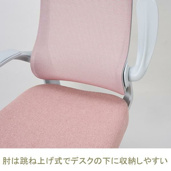 肘は跳ね上げ式なのでデスクの下に収納しやすい。背もたれは通気性の良いメッシュ素材です。