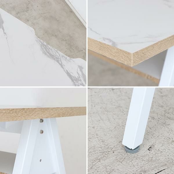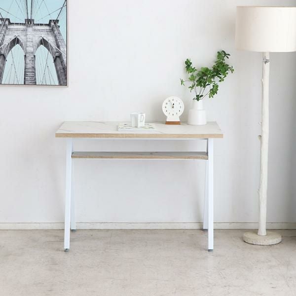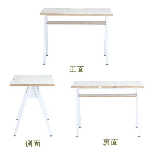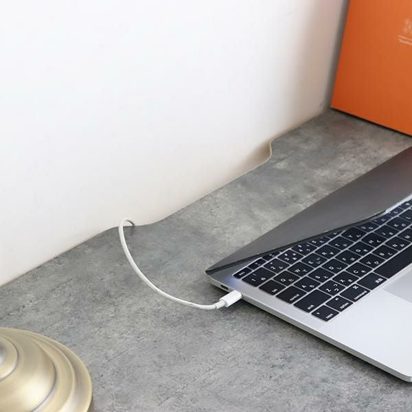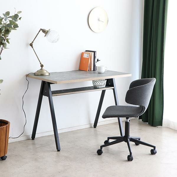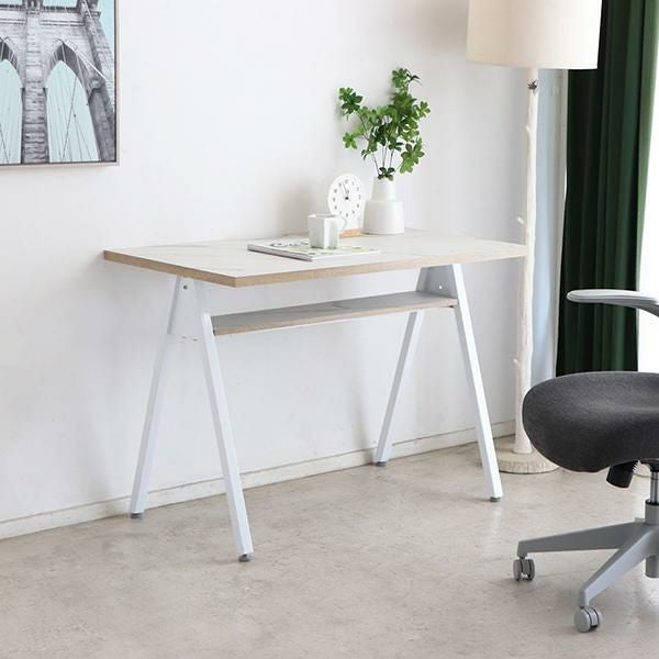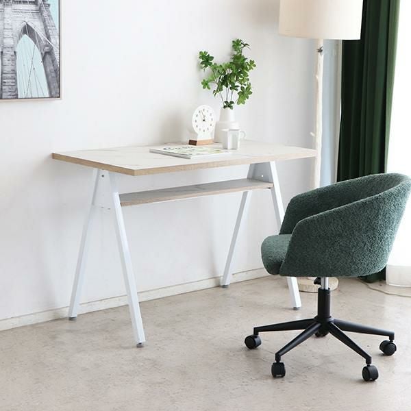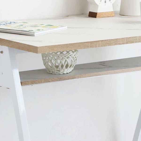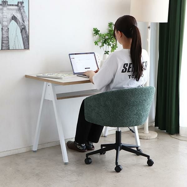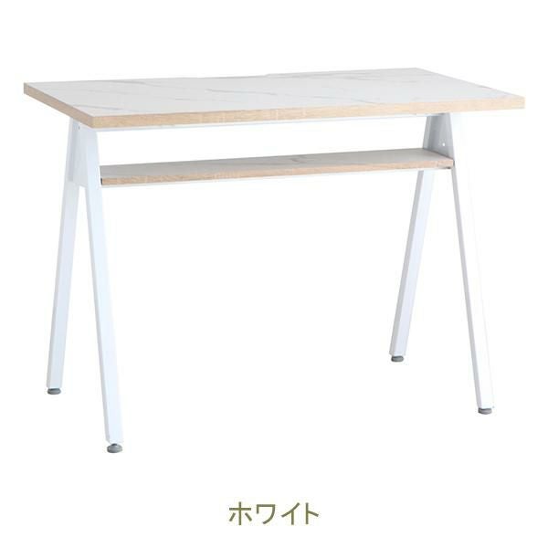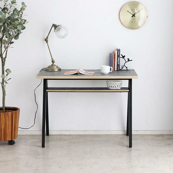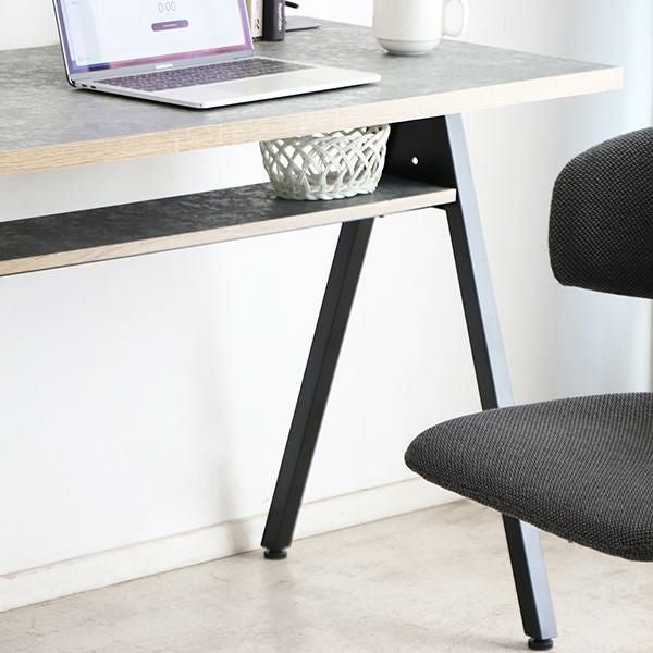天板にはコード通しの加工が施されているので、パソコンやスマホの充電ができます。コンパクトなお部屋にも置きやすい、圧迫感のないサイズ感とシンプルなデザインながら棚板付きなのでちょっとした小物の収納もできます。足元はアジャスター付きなので、ガタつきなども調整次第でストレスフリーに使えます。天板に合わせた脚部の配色がポイントです。