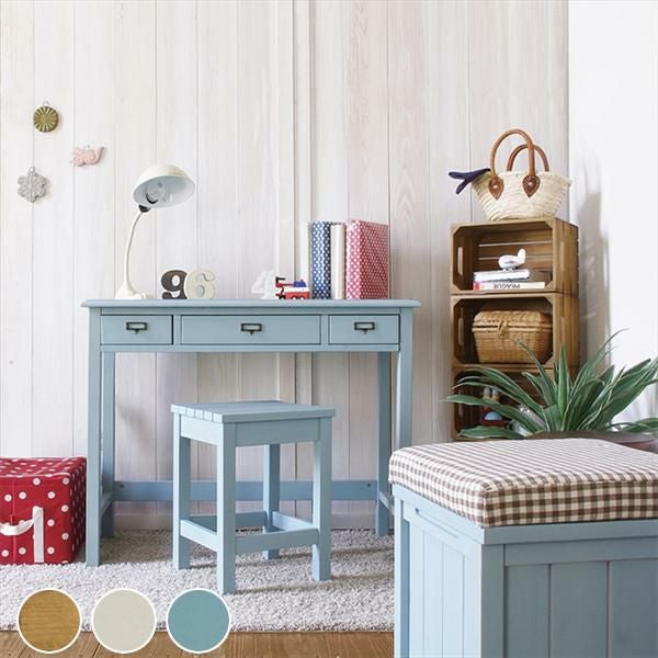 アンティーク調取手の引き出し収納が3杯付いたデスク。引出しの中敷きにはドット柄のファブリックを使用し、開けた時にワクワクするようなデザインに。布を張り替えてお好みの柄にdiyも可能です。