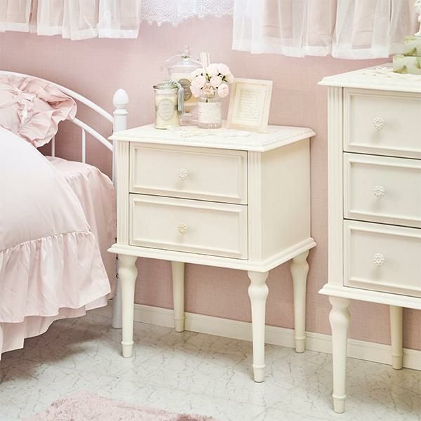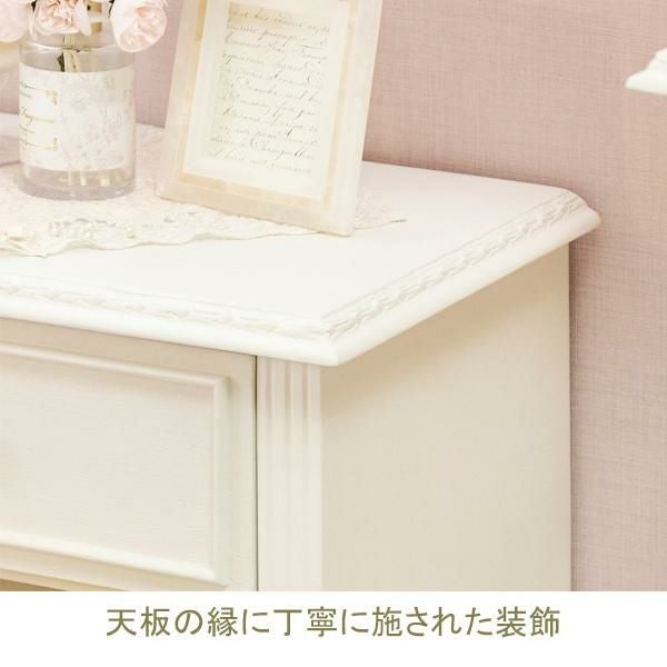 天板縁に施されたアンティークのような繊細な彫刻が特徴のサイドチェスト。ベッドサイドやソファの横に。