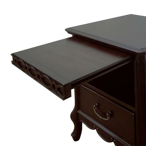 18世紀、ルイ15世時代のフランス宮廷から始まり、貴族の宮殿や上流階級のご婦人を中心に流行した、直線を排した軽快で華麗なフランス・サロン文化を彩る装飾様式だったロココ調家具のエッセンスを残したフレンチカントリースタイルを、よりカジュアルに実用的なアイテムでセレクトしたトータルコーディネートシリーズです。マホガニー材を贅沢に使い、表面は厳選された木目を使った化粧張りを施し、フレンチエレガンスの代名詞といえる「カブリオールレッグ」(猫脚)と、なめらかな女性的な美しいラインとマホガニー無垢材を削り出した彫刻が特徴です。