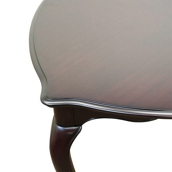 18世紀、ルイ15世時代のフランス宮廷から始まり、貴族の宮殿や上流階級のご婦人を中心に流行した、直線を排した軽快で華麗なフランス・サロン文化を彩る装飾様式だったロココ調家具のエッセンスを残したフレンチカントリースタイルを、よりカジュアルに実用的なアイテムでセレクトしたトータルコーディネートシリーズです。マホガニー材を贅沢に使い、表面は厳選された木目を使った化粧張りを施し、フレンチエレガンスの代名詞といえる「カブリオールレッグ」(猫脚)と、なめらかな女性的な美しいラインとマホガニー無垢材を削り出した彫刻が特徴です。