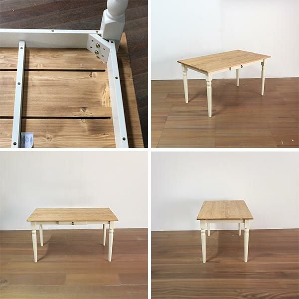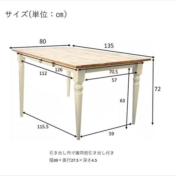 スクエアなフォルムとアンティーク調の取っ手などディテールが特徴的なダイニングテーブル(幅135cm)。
