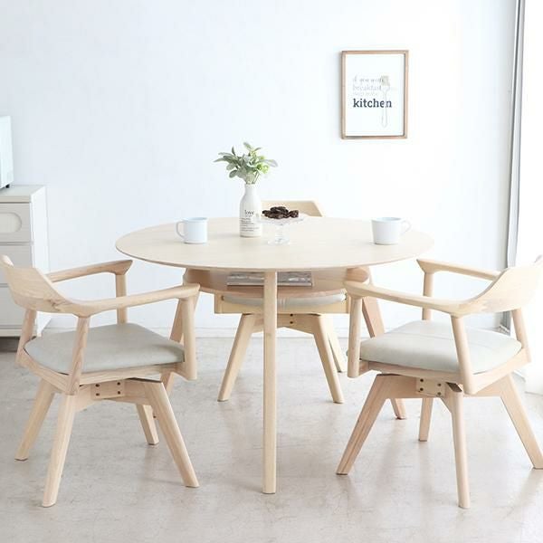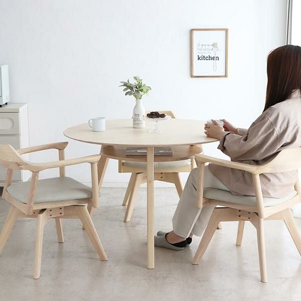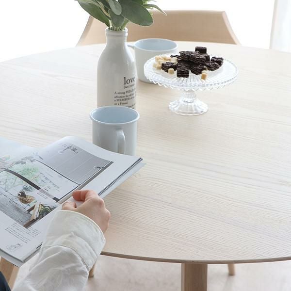 アッシュ材の木目を生かした、ホワイト仕上げで木の存在感いっぱいのテーブル。天板の下には小物が収納できる便利な棚付きでテーブル上もすっきり。ミルキーホワイトカラーがお部屋を優しい印象にしてくれます。