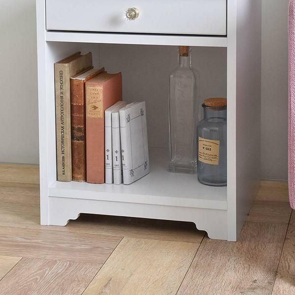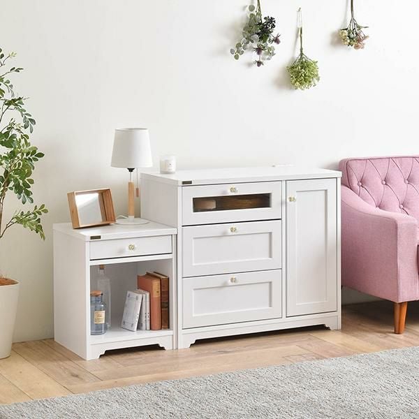 クラシックでフェミニンなデザインとカラーの家具シリーズ。アンティーク取っ手とクリスタル取っ手の2種類が付属しているので、どちらでも好きなほうを付けられます。