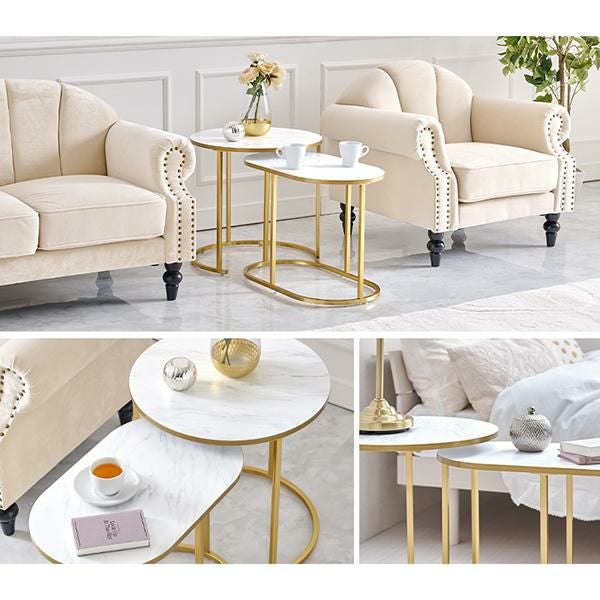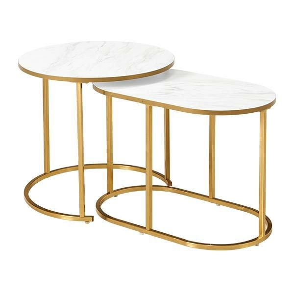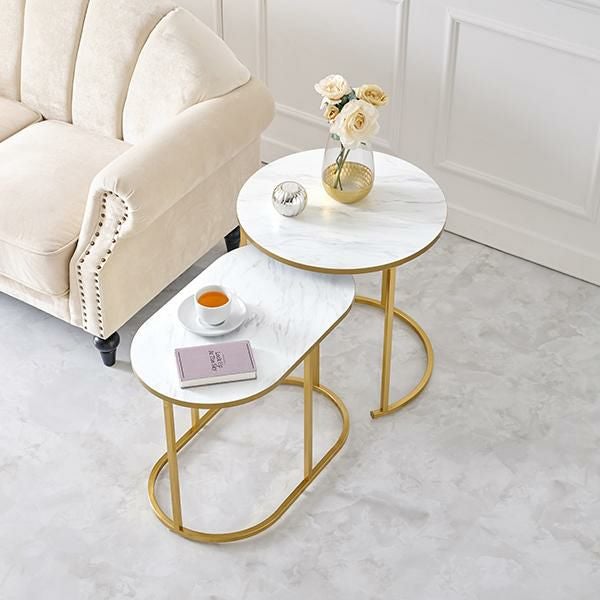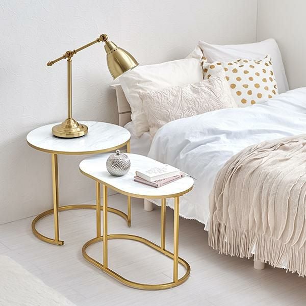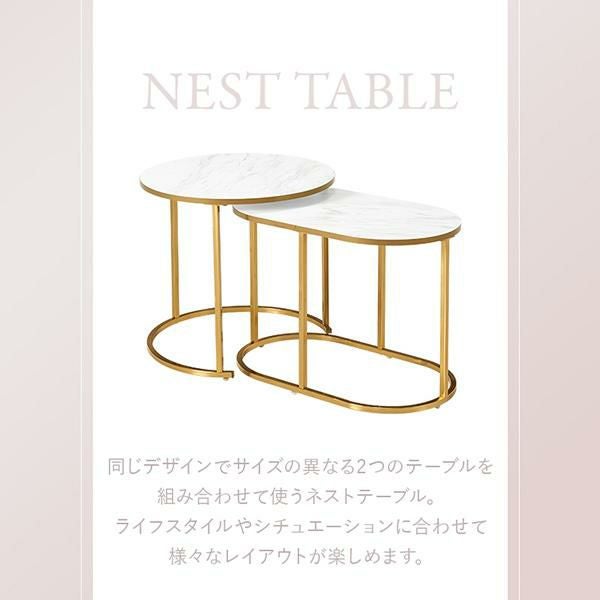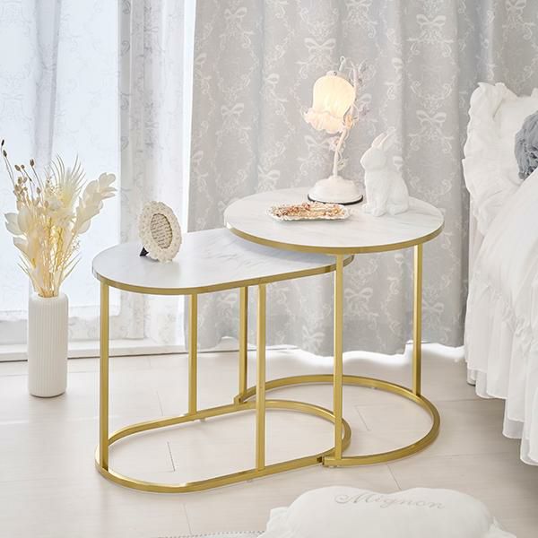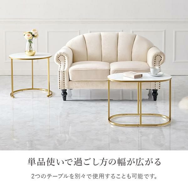 伸縮可能な大理石調のマーブル模様がかわいいラウンド型のサイドテーブル。大・小2つ重なったテーブルは引き出す幅をお部屋に合わせて調整でき、1台ずつでも使用可能でとっても便利!