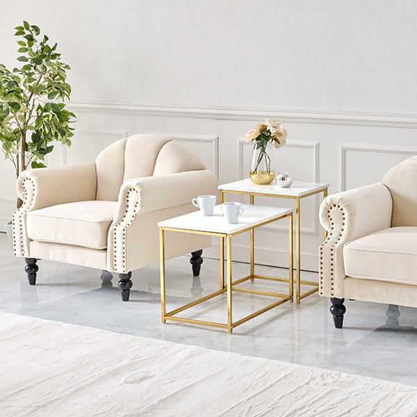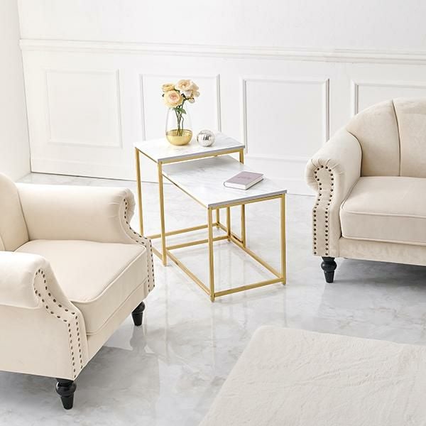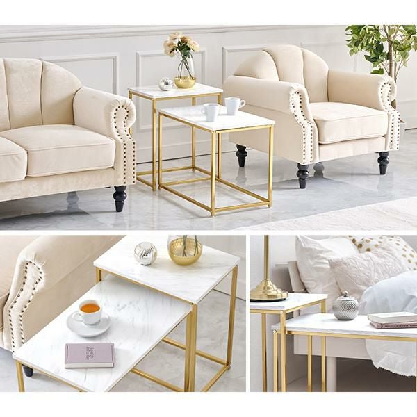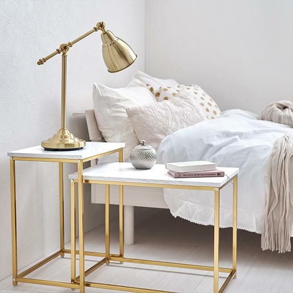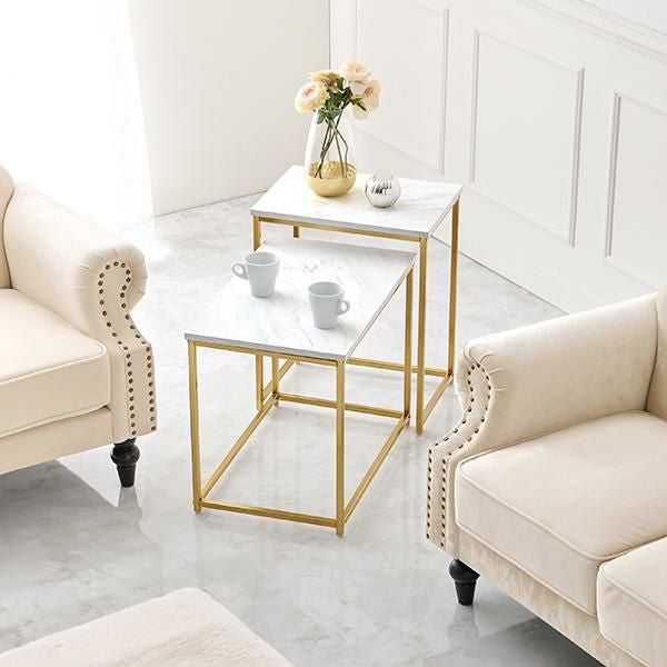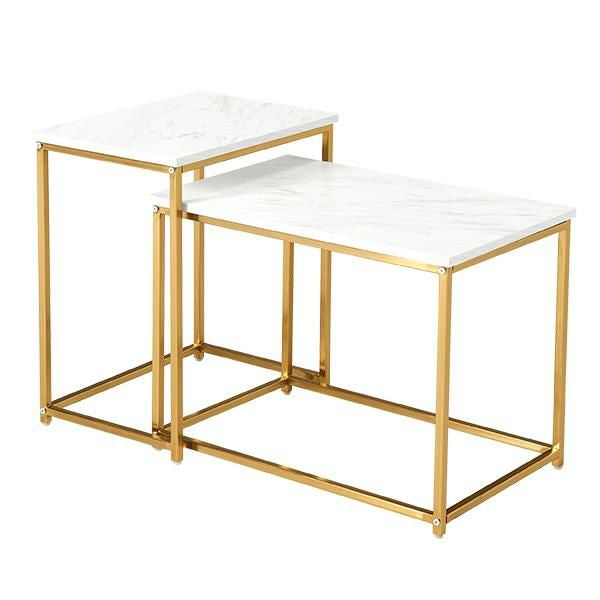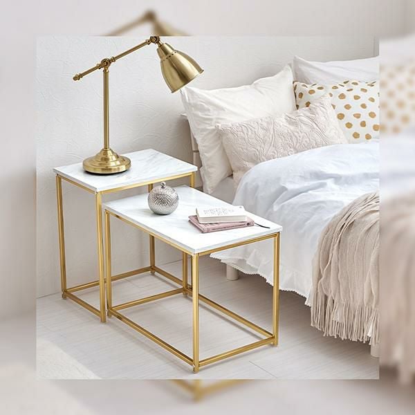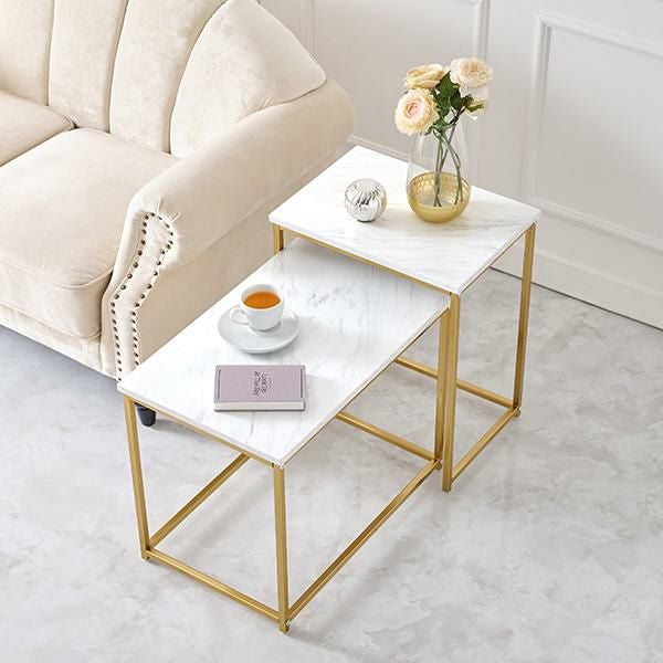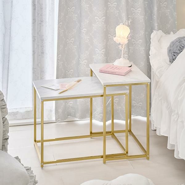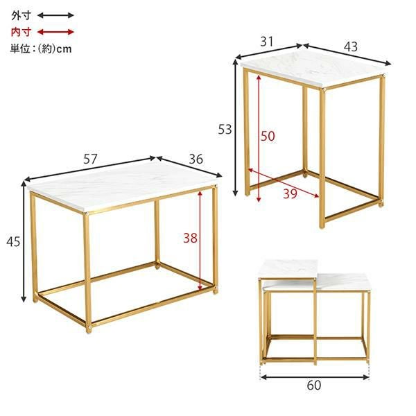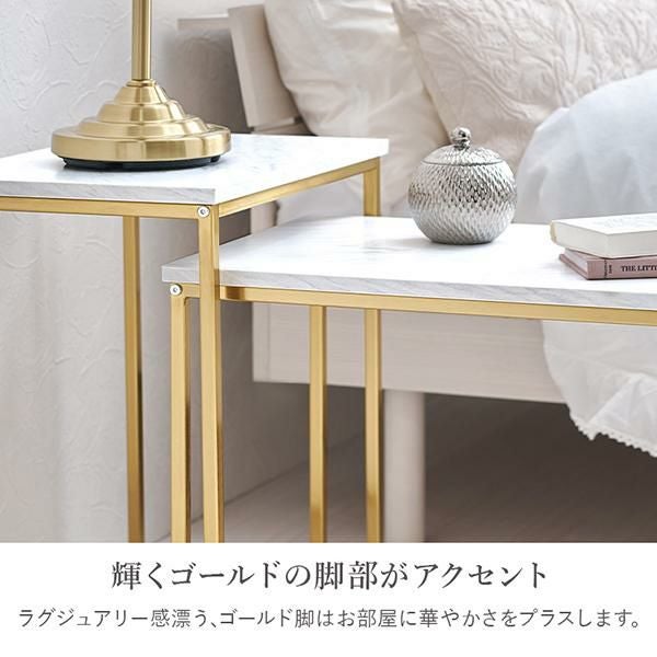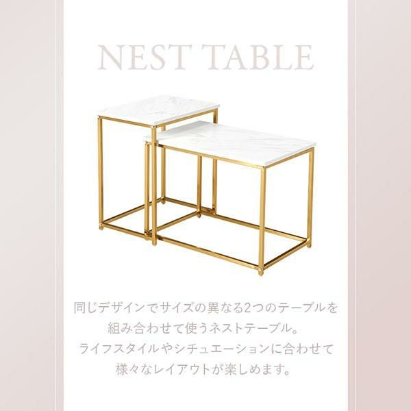 伸縮可能な大理石調のマーブル模様がかわいいスクエア型のサイドテーブル。大・小2つ重なったテーブルは引き出す幅をお部屋に合わせて調整でき、1台ずつでも使用可能でとっても便利!