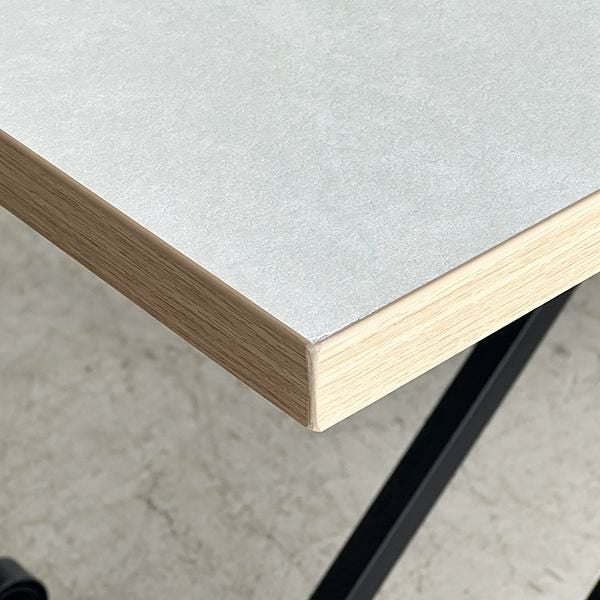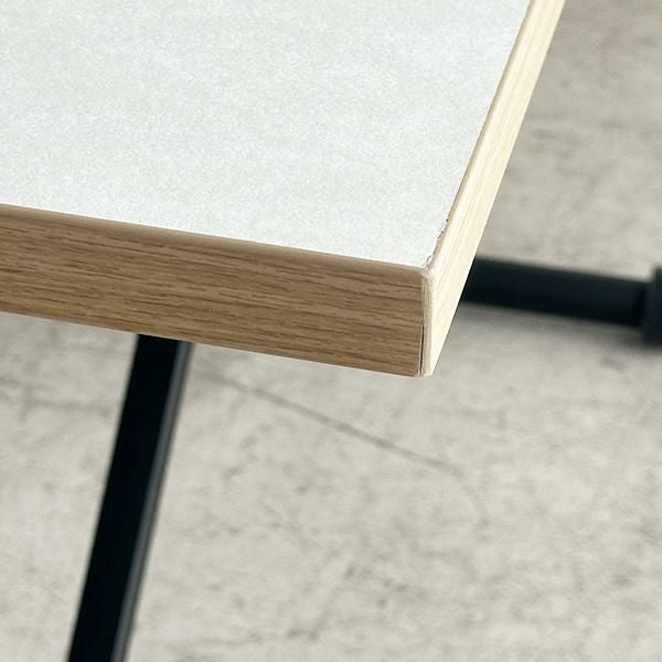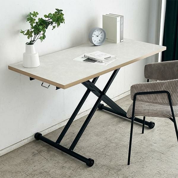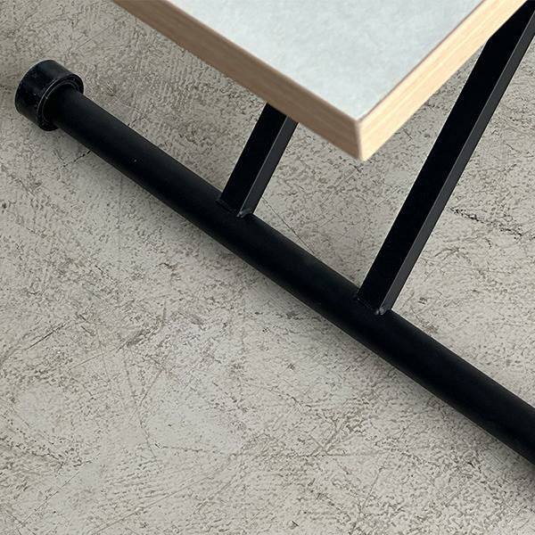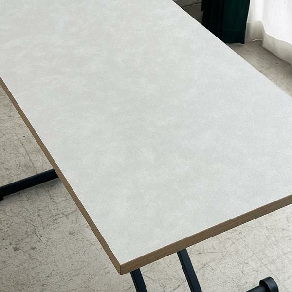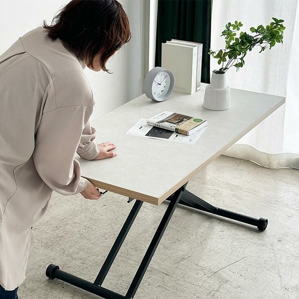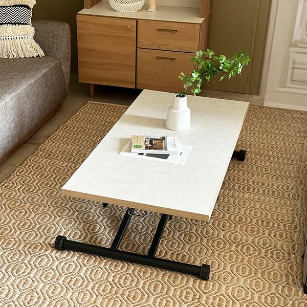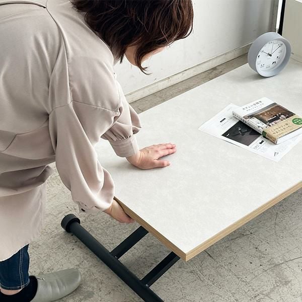 高さを変えシチュエーションによって使い分けができるテーブル。ソファーでローテーブルとして、チェアと合わせてダイニングテーブルとして、作業するときは食事の時より少し高く設定してなど、シーンに合わせて高さを変えることで無理な体制をとることなく、快適に過ごすことができます。質感のあるダップ化粧板を使ったテクスチャあるホワイト天板と側面の温かみのある木目で洗練されたオシャレな空間に。リビングテーブルやデスク、ダイニングテーブルの補助台としても便利です。