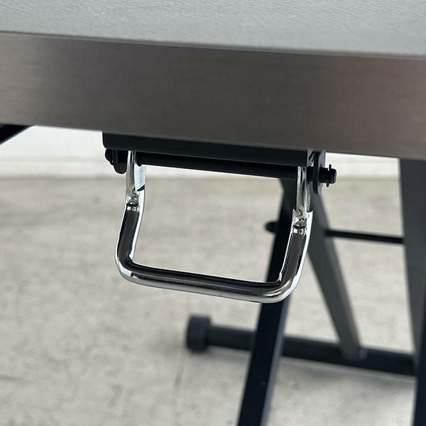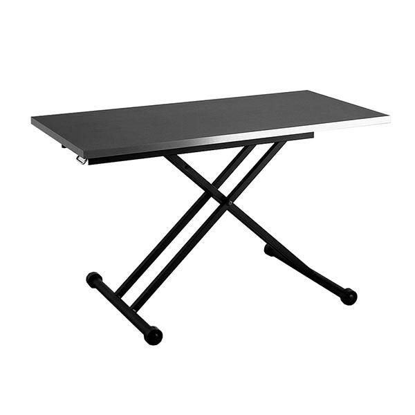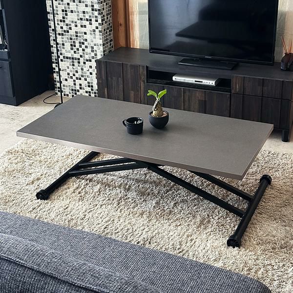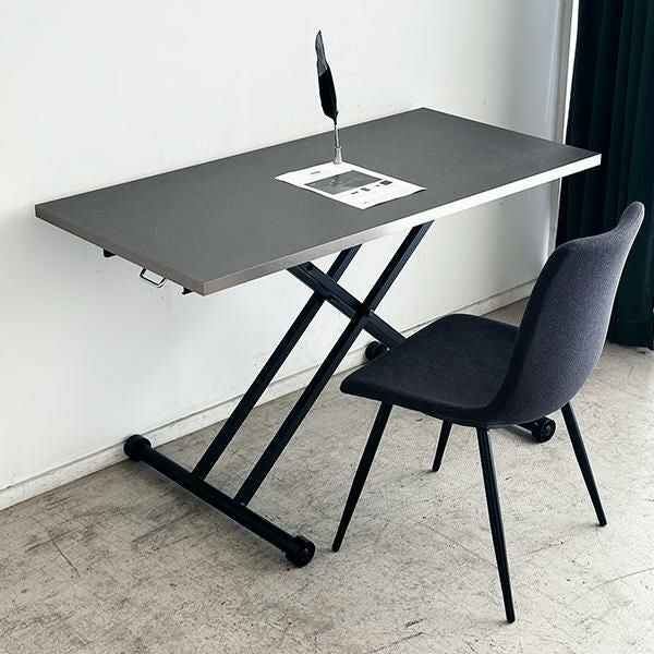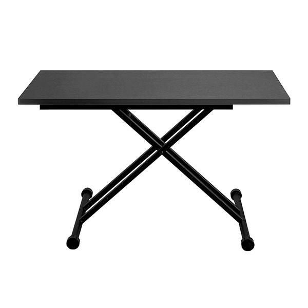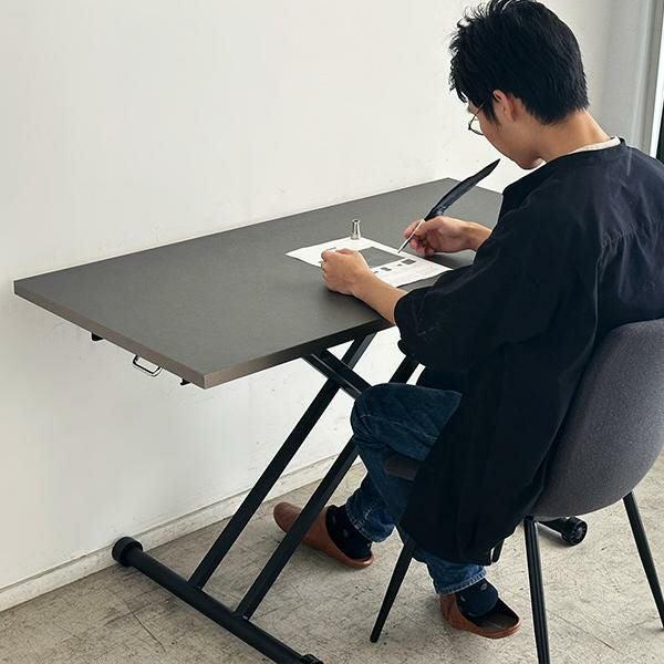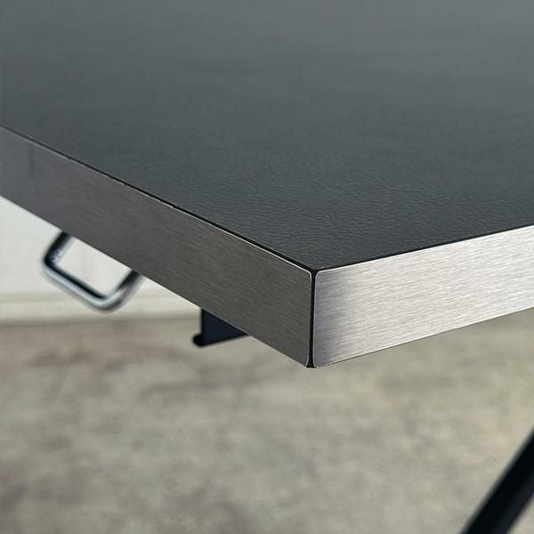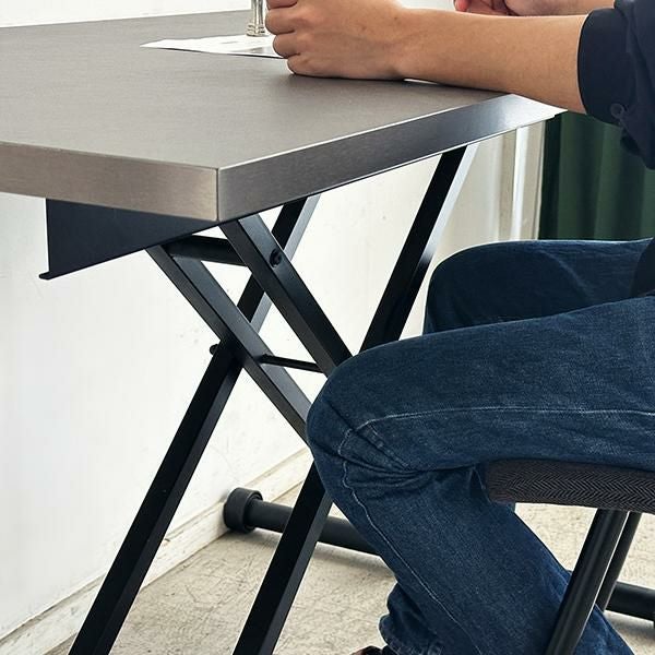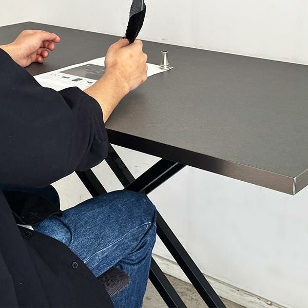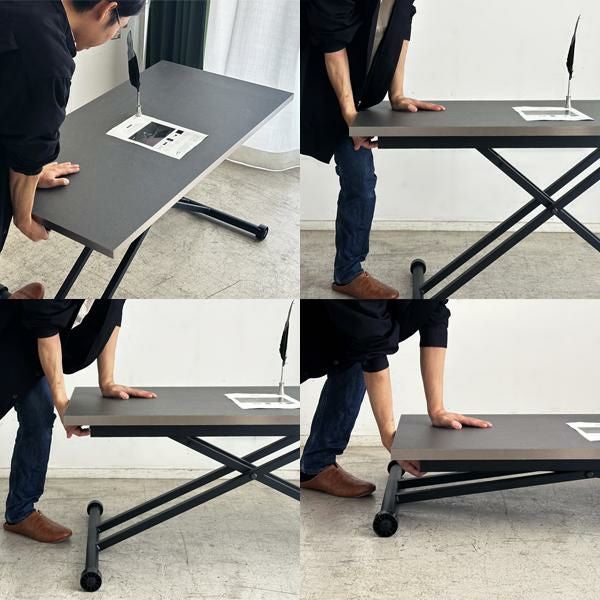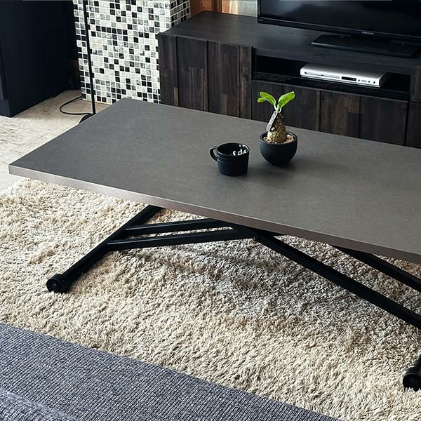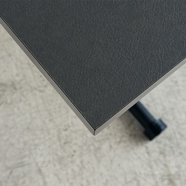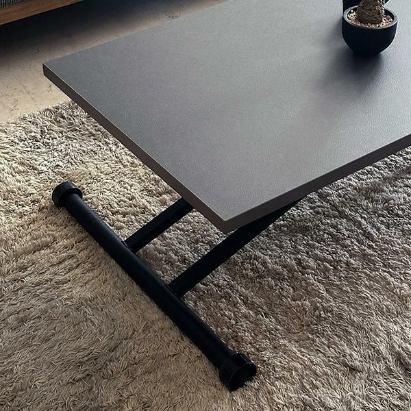 高さを変えシチュエーションによって使い分けができるテーブル。ソファーでローテーブルとして、チェアと合わせてダイニングテーブルとして、作業するときは食事の時より少し高く設定してなど、シーンに合わせて高さを変えることで無理な体制をとることなく、快適に過ごすことができます。レザーに見えるメラミン天板にメタリックな小口ラインを施したスタイリッシュなデザインでオシャレな空間に。リビングテーブルやデスク、ダイニングテーブルの補助台としても便利です。