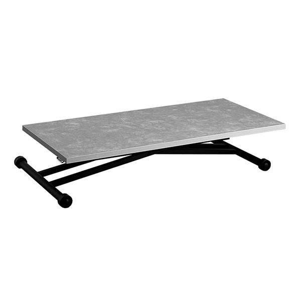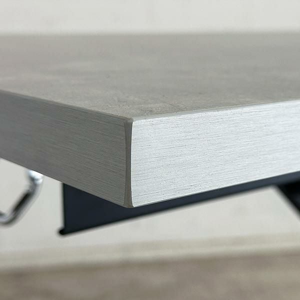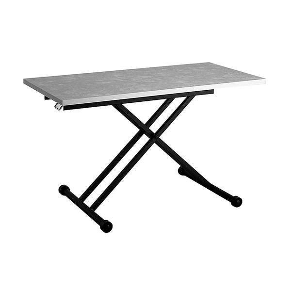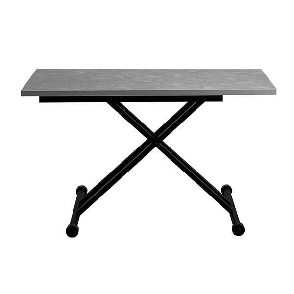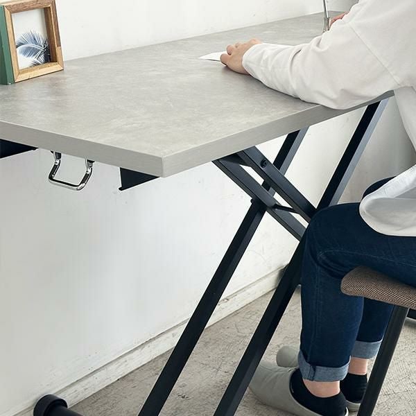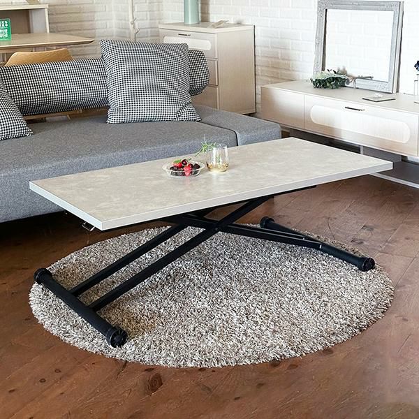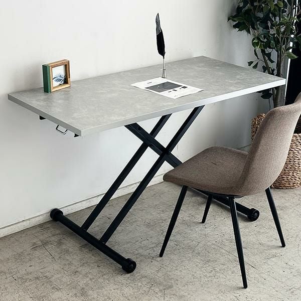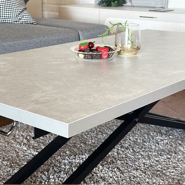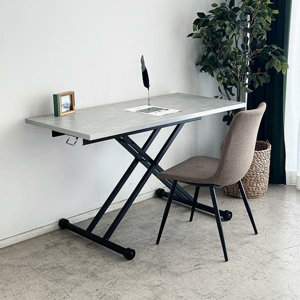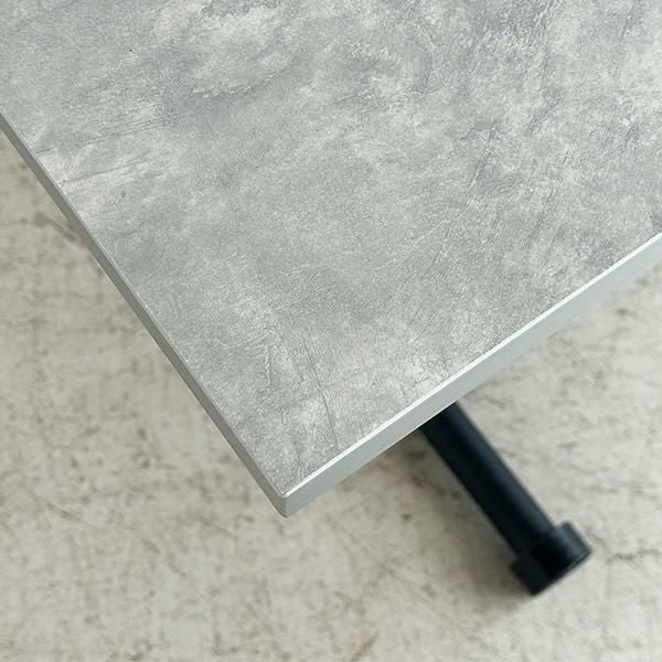高さを変えシチュエーションによって使い分けができるテーブル。ソファーでローテーブルとして、チェアと合わせてダイニングテーブルとして、作業するときは食事の時より少し高く設定してなど、シーンに合わせて高さを変えることで無理な体制をとることなく、快適に過ごすことができます。汚れが目立ちにくく高級感も出せるライトグレーの石目柄の天板にメタリックなグレーを合わせ、スタイリッシュでフォーマルな空間に。リビングテーブルやデスク、ダイニングテーブルの補助台としても便利です。