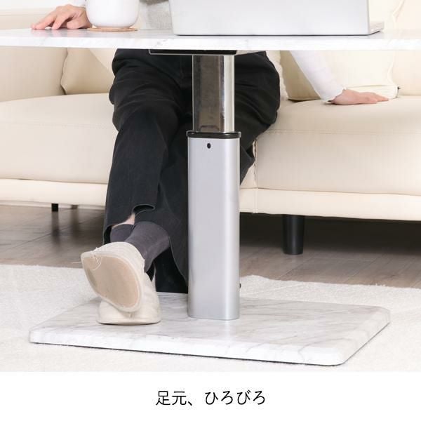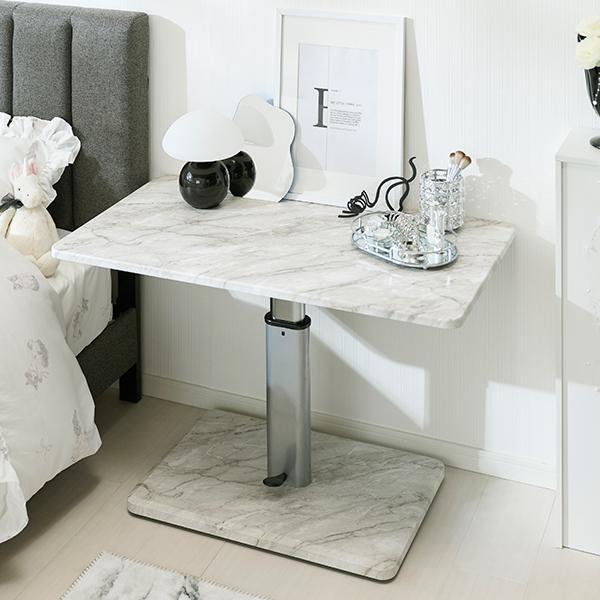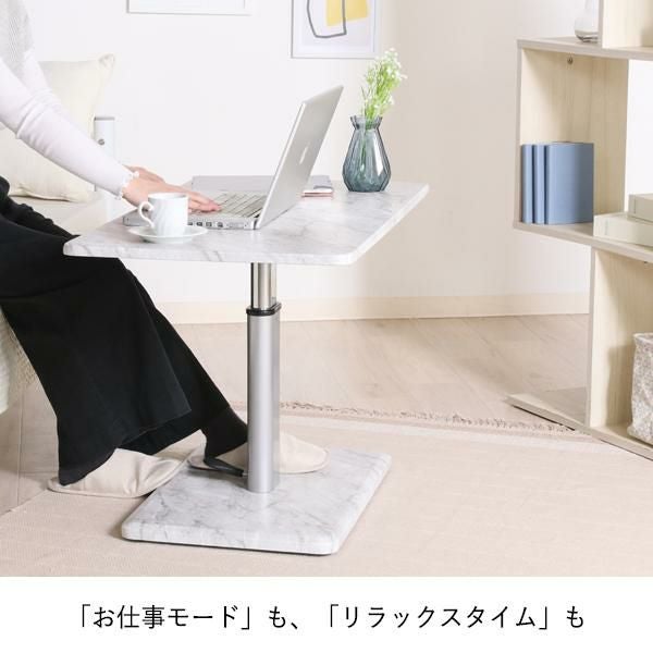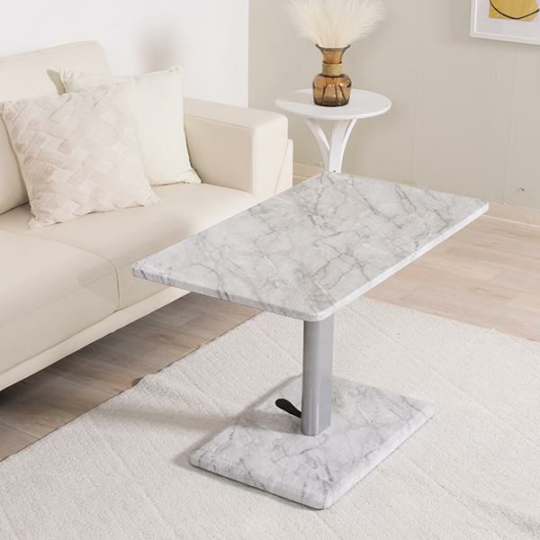 大理石調のおしゃれな昇降テーブル。ペダル式で高さ調節(43~57cm)ができ、ソファでの作業も快適です。足元ゆったりの1本脚&移動に便利なキャスター付きで、実用性も抜群。