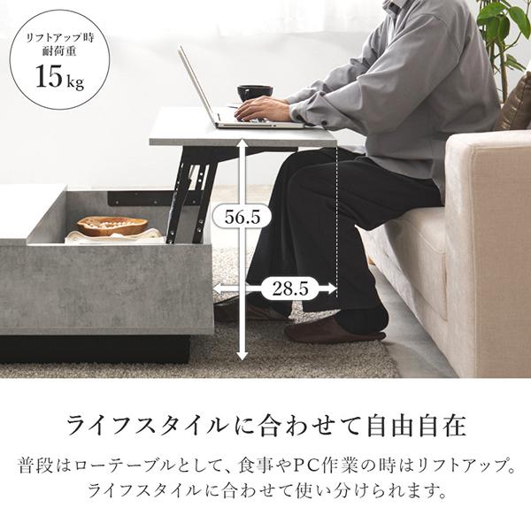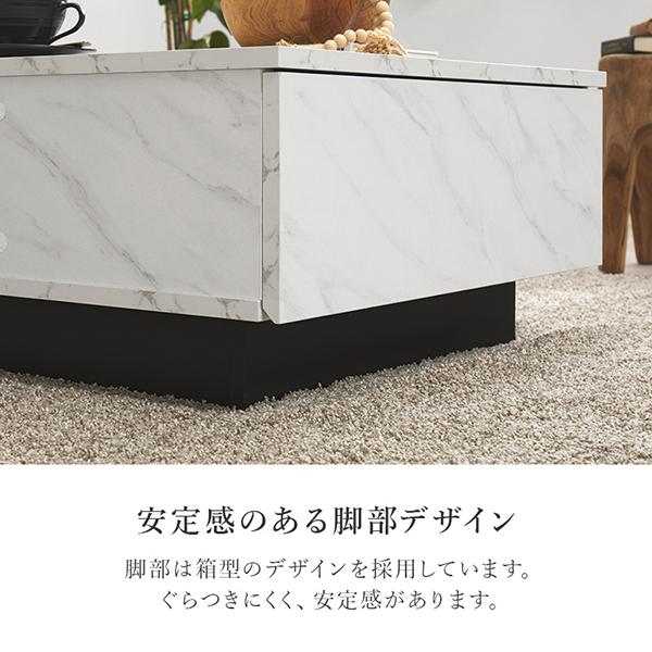 「お部屋をすっきり見せたいけれど、おしゃれな雰囲気も譲れない」そんな願いを叶えてくれるストーン調のデザインテーブル。リアルな質感を再現した天板が、お部屋をぐっと垢抜けた都会的な印象へと導きます。デザイン性はもちろん、使い勝手が良い昇降タイプ。片側の天板が手元まで持ち上がるので、ソファに座ったままのPC作業や食事も、無理のない姿勢で心地よく楽しめます。天板下には隠し収納スペースがあり、ノートパソコンやリモコンなど、生活感の出やすいアイテムをスマートに片付けられるのも魅力です。脚部には、洗練された印象を与える箱型のデザインを採用しました。しっかりと全体を支えてくれるので、ぐらつきにくく安定感があるのも嬉しいポイントです。毎日の何気ないひとときをクラスアップしてくれる、美しさと機能性が詰まった一台です。