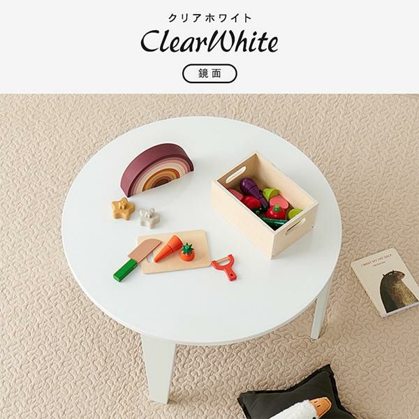 鏡面仕上げのモノトーンカラー「クリアホワイト」「クリアブラック」、マットな質感が落ち着く艶消し仕上げの、そのほか「アースカラー」「木目調」の選べる8色!コンパクトサイズでワンルームや1人部屋にぴったりな円形テーブルです。