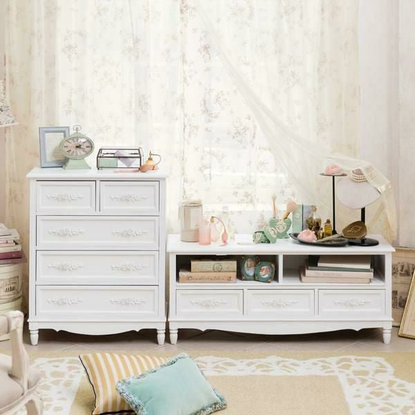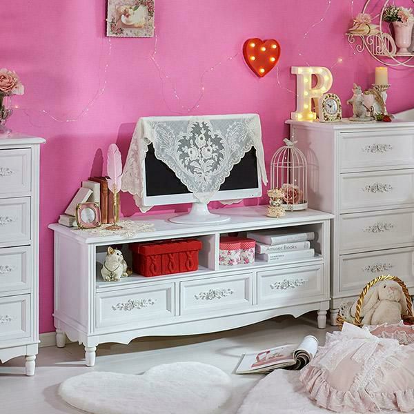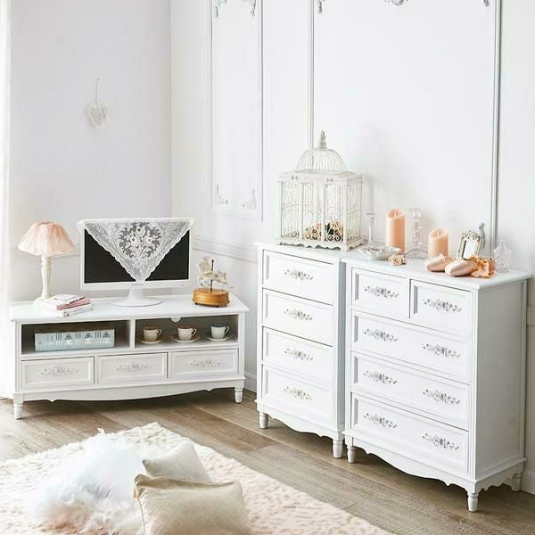 優雅なホワイトを基調に美しいローズモチーフを装飾した取っ手が美しい、高級感漂うクラシカルな家具シリーズ。テレビ台にはコード穴付、引き出し前には段差をつけるなど、機能的なのも魅力。チェストとテレビ台は、お部屋にあわせて選べる2サイズ展開。