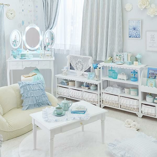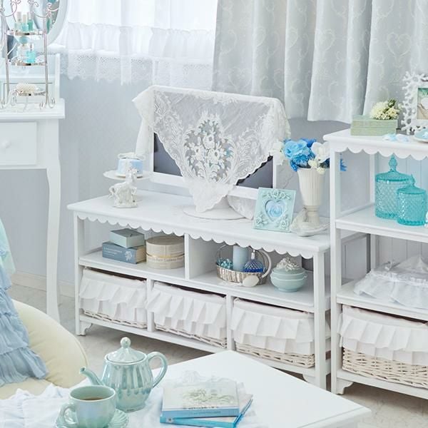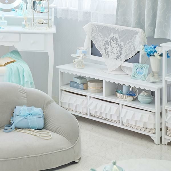 2段フリルの布付バスケットとスカラップのデザインの可愛いをたっぷり詰め込んだバスケット付きテレビ台