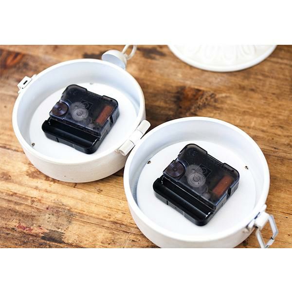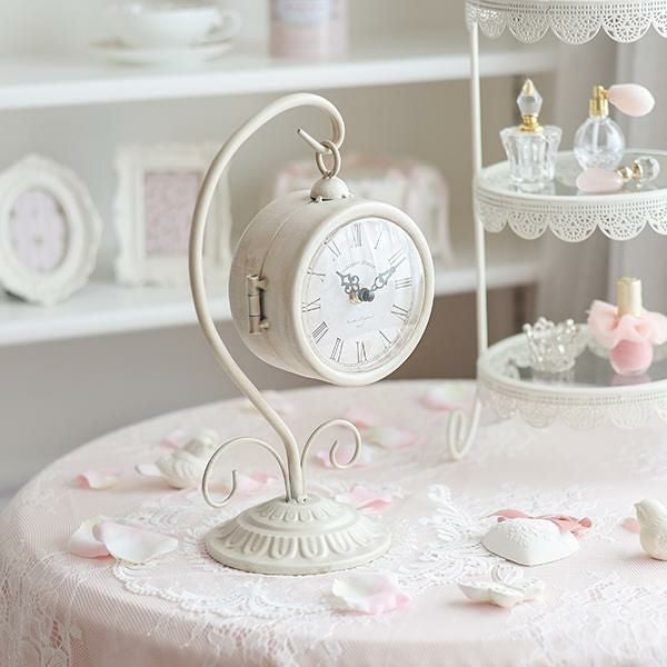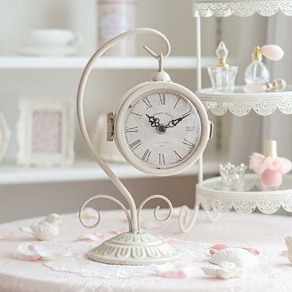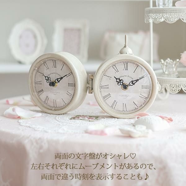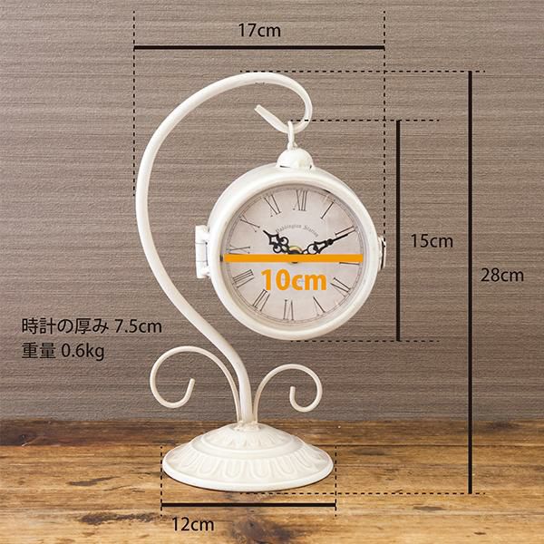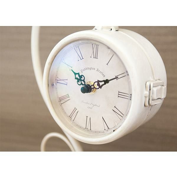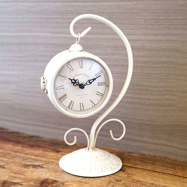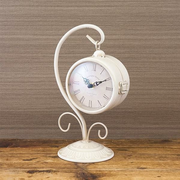 海外の駅やお家で見かけそうな、両面の置き時計です。吊り下げ式の時計は両面に文字盤があるので、実用性のあるインテリアとしておすすめ。文字盤は時間を確認しやすいはっきりとしたデザイン。フックに引っ掛けるだけなので、時計だけを簡単に取り外しできます。少し黄色味がかったアンティークホワイトのカラーが優しい印象です。