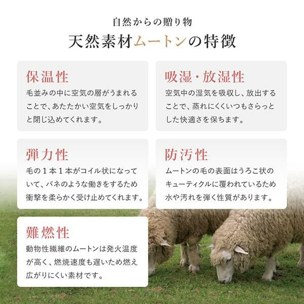 天然素材のムートンは、吸水性、放湿性に優れ、火にも強く、燃え広がりにくい、まさに呼吸する素材。表面は水を弾く性質もあり、自然の効力をもった人にやさしい万能素材です。包み込まれるようにやわらかで、優しいぬくもりがあふれるタッチ感は、化学繊維とは異なる特別な感触。中材にはウレタンフォームを使用しているのでクッション性があります。紐付きなので、チェアに固定できるのも嬉しいポイント。